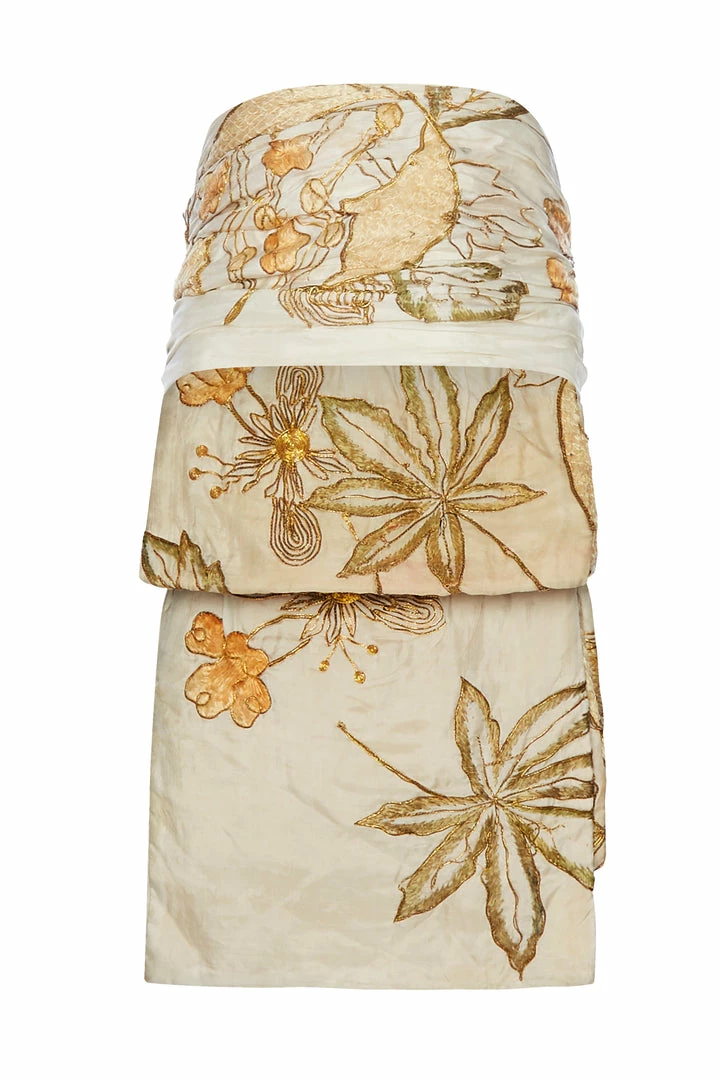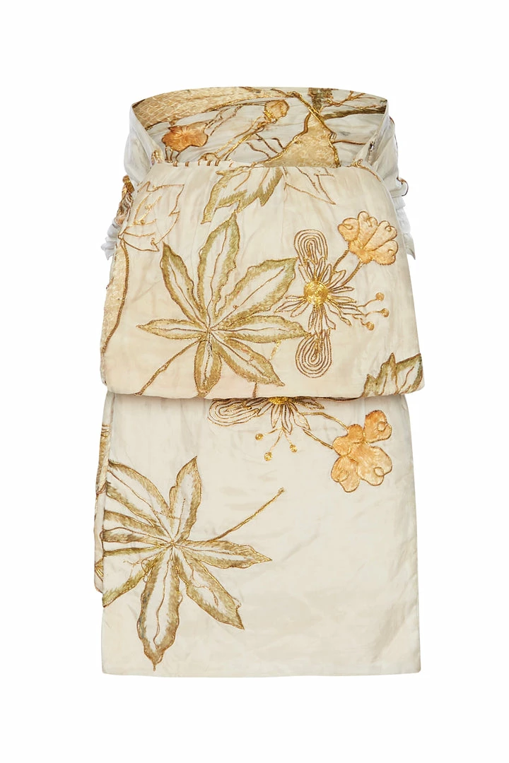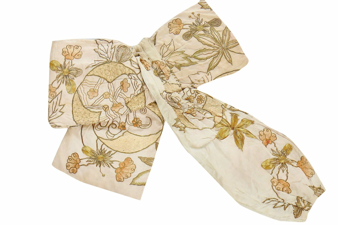 An original and exquisitely handcrafted obi for kimono; embroidered leaves and patterns; gold and beige hues; good condition