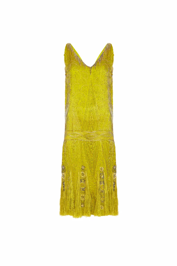 A beaded chartreuse satin flapper dress, late 1920s, – unlabelled, covered with seed and bugle beads, the hem with silk fringes and spangled with rhinestones,
