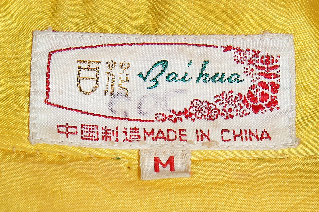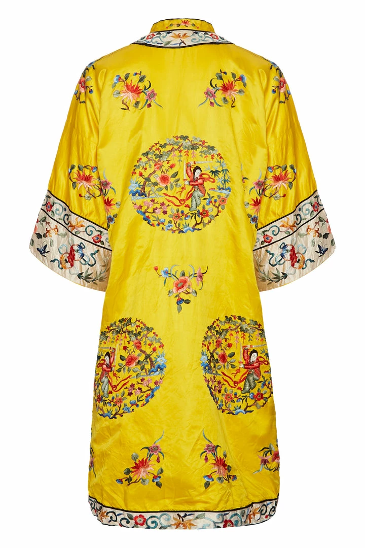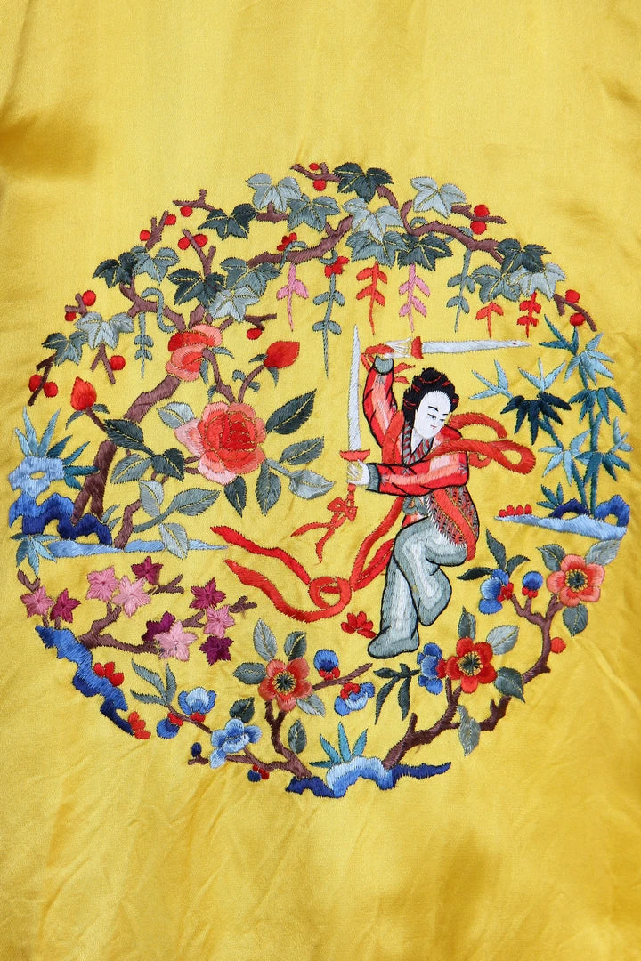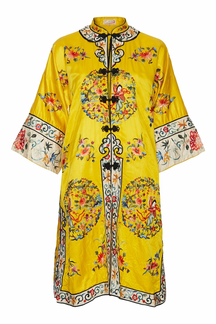 An embroidered yellow satin robe, Chinese, 1960; labelled size M