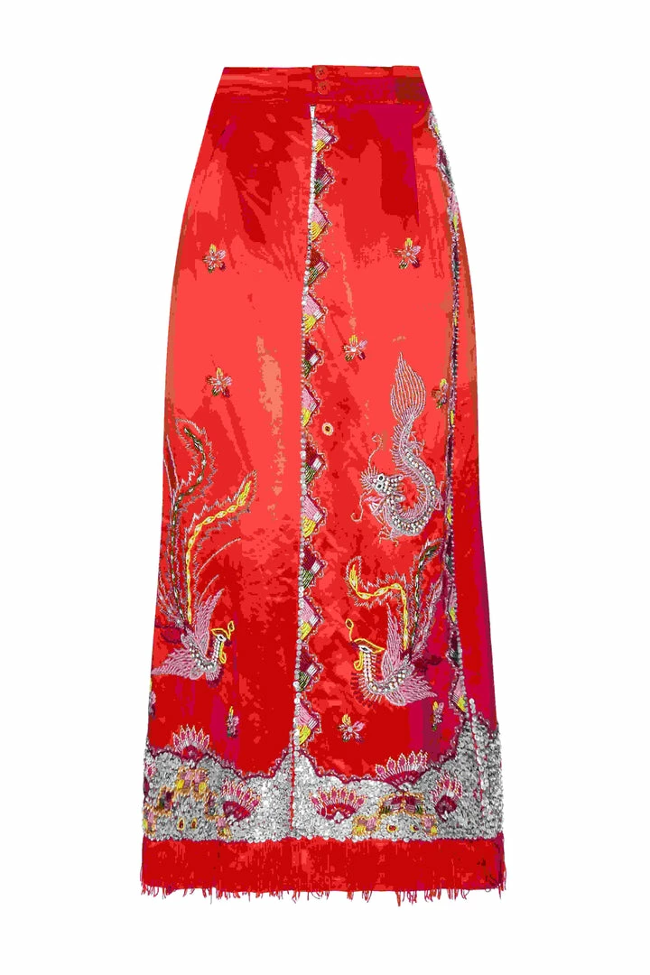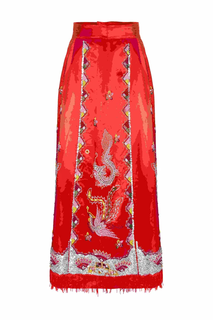 A long high-waisted red satin embroidered skirt with diamanté’s and beads with beautiful Chinese patterns