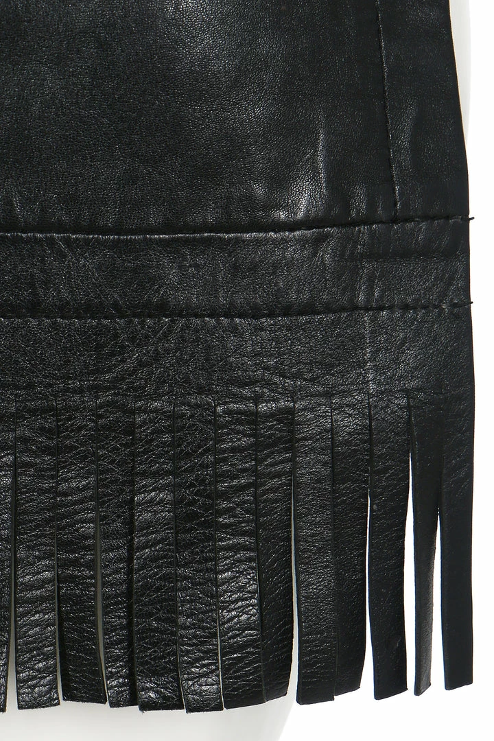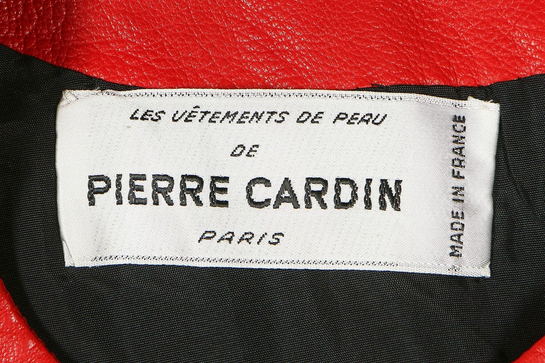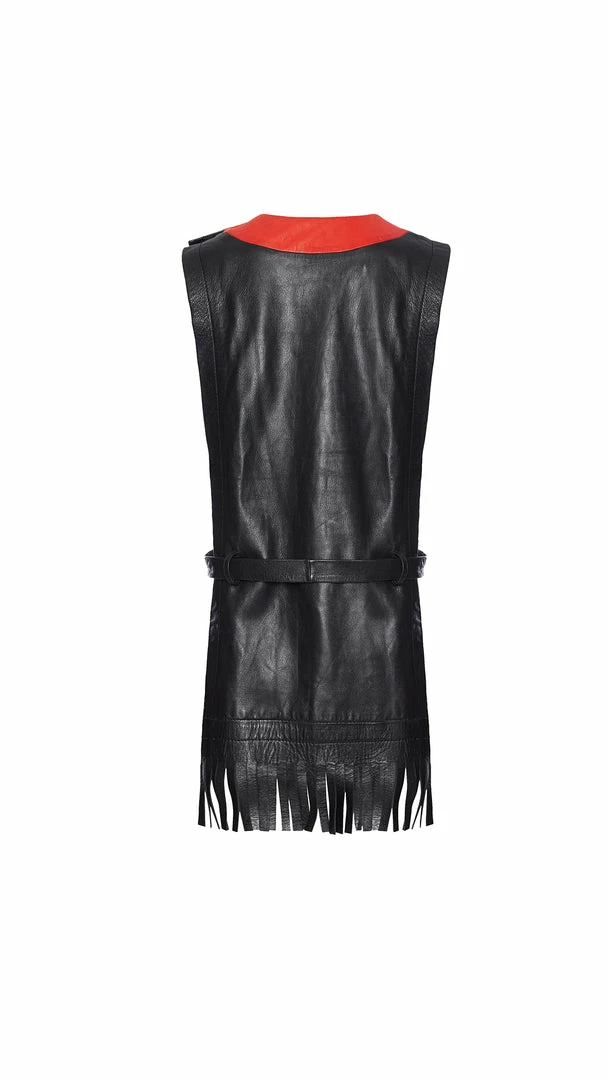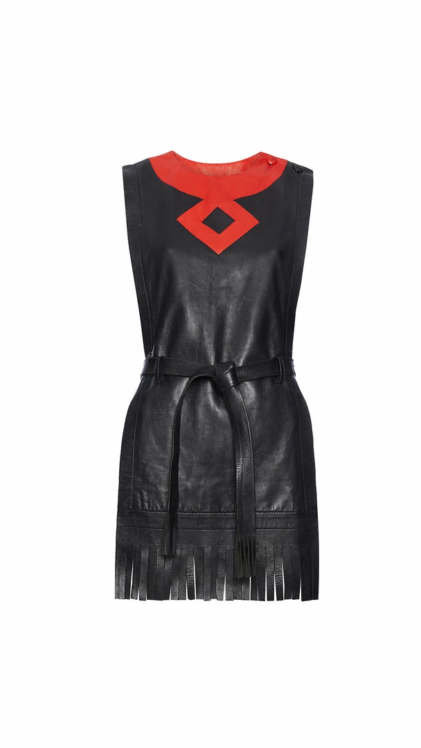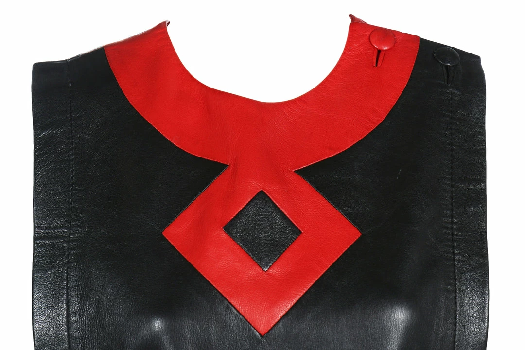 A rare Pierre Cardin black lambskin leather tabard dress with red geometric neckline and diamond-shaped inserts to collar; a special piece from his Space Age collection circa 1960s; sleeveless and above the knee length