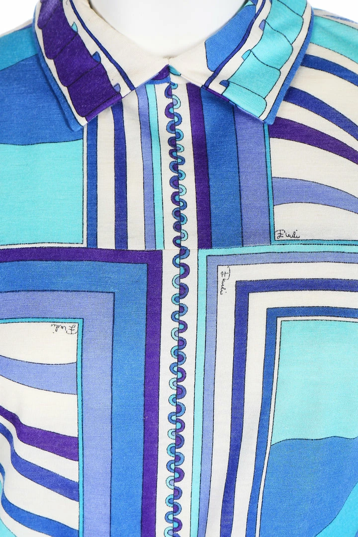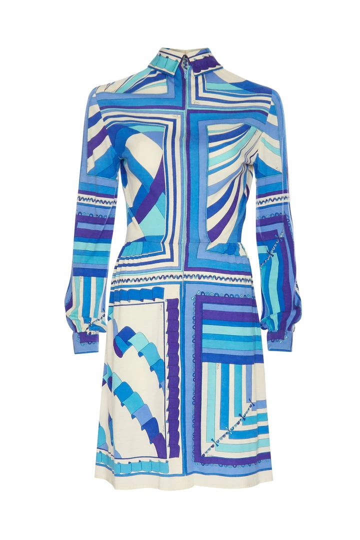 An original Pucci summer dress in shades of aquatic blue; knee-length with Peter Pan button up collarÂ
