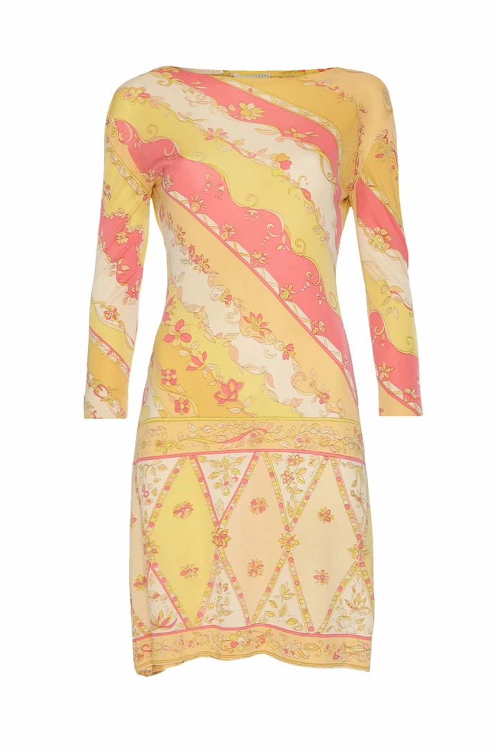An original Pucci summer dress in peachy yellow shades; above the knee length with crew-neck and 3/4 sleeves; perfect condition