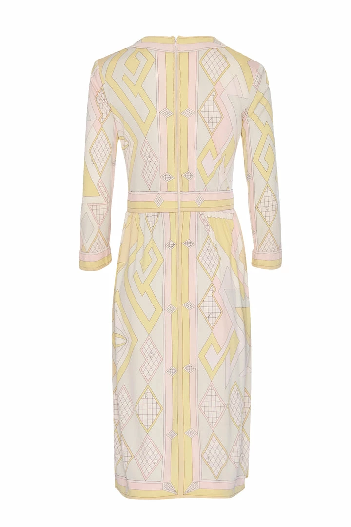 An original Pucci summer dress in soft yellow and pink shades; knee-length with crew-neck and 3/4 sleeves; perfect condition