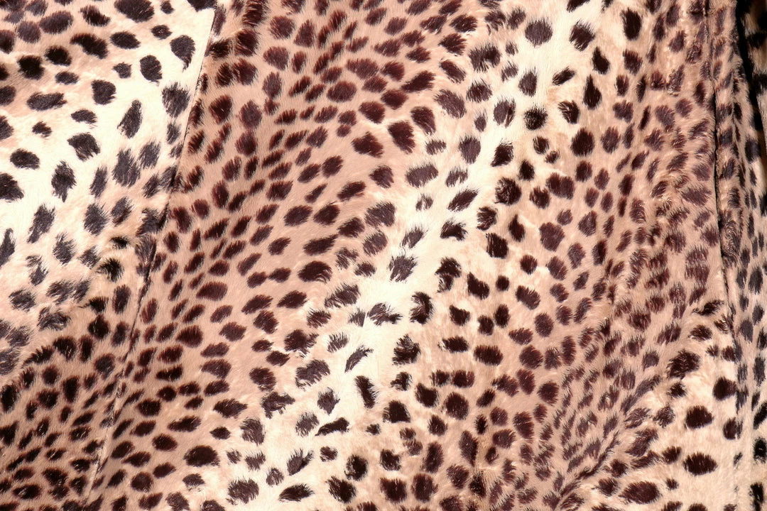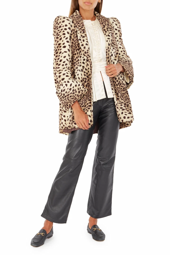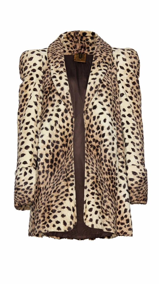 An iconic Biba faux leopard plush swing jacket originating from the early 70s; 1973-75; printed signature ‘Biba’ art nouveau label; 40s inspired with exaggerated padded shoulders; deep cuffs;