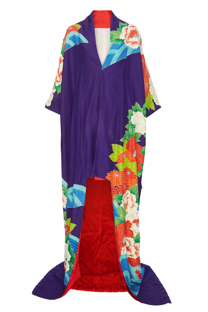 Traditional 1970s silk Japanese kimono; square sleeves and long floor length robe depicting a vibrant garden with a running stream