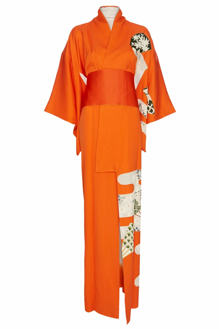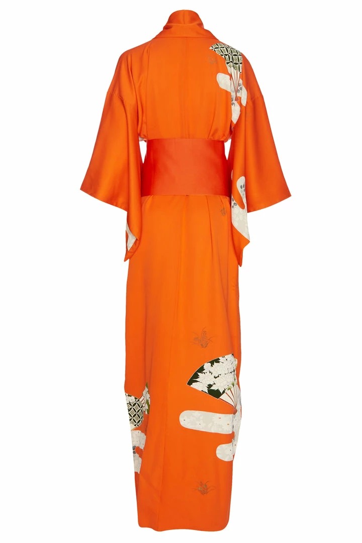 Traditional 1970s silk red Japanese kimono; square sleeves and long floor length robe