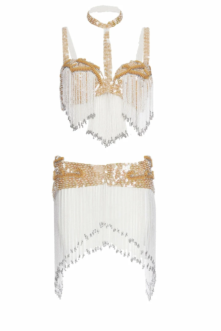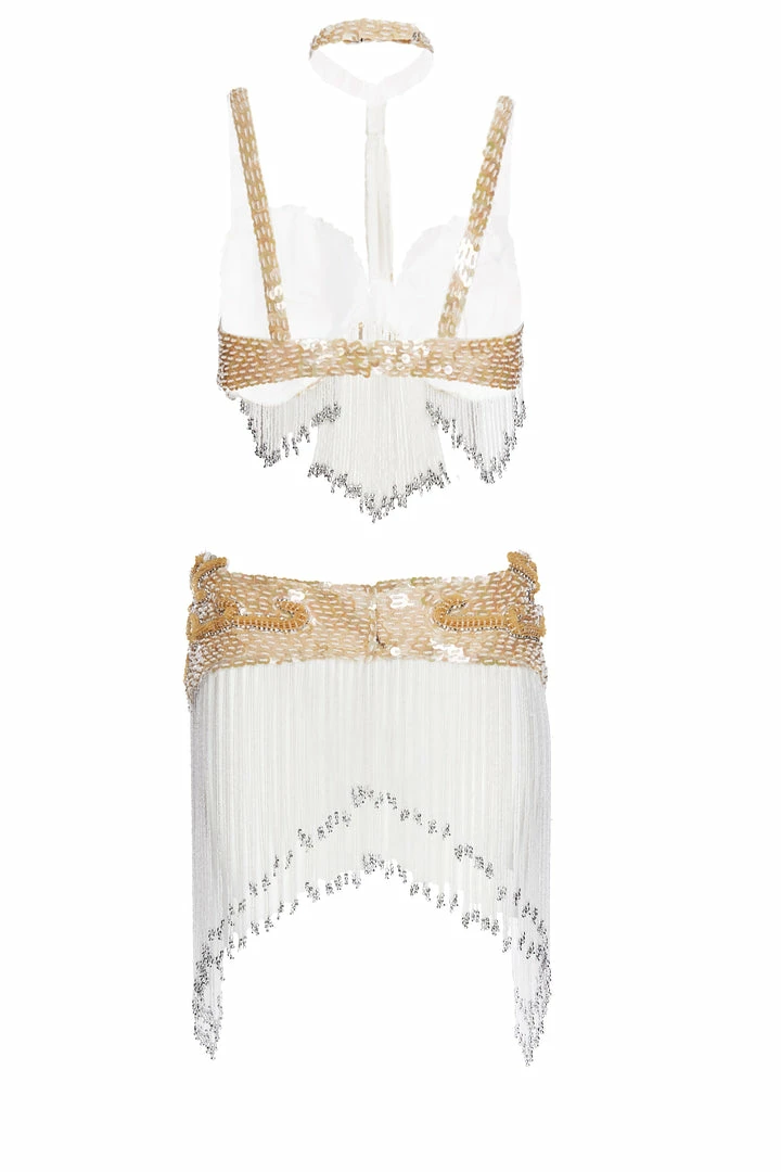 An original 1980s showgirl outfit adorned with iridescent sequins, beads and fringing; bra bustier and skirt; attach white lining