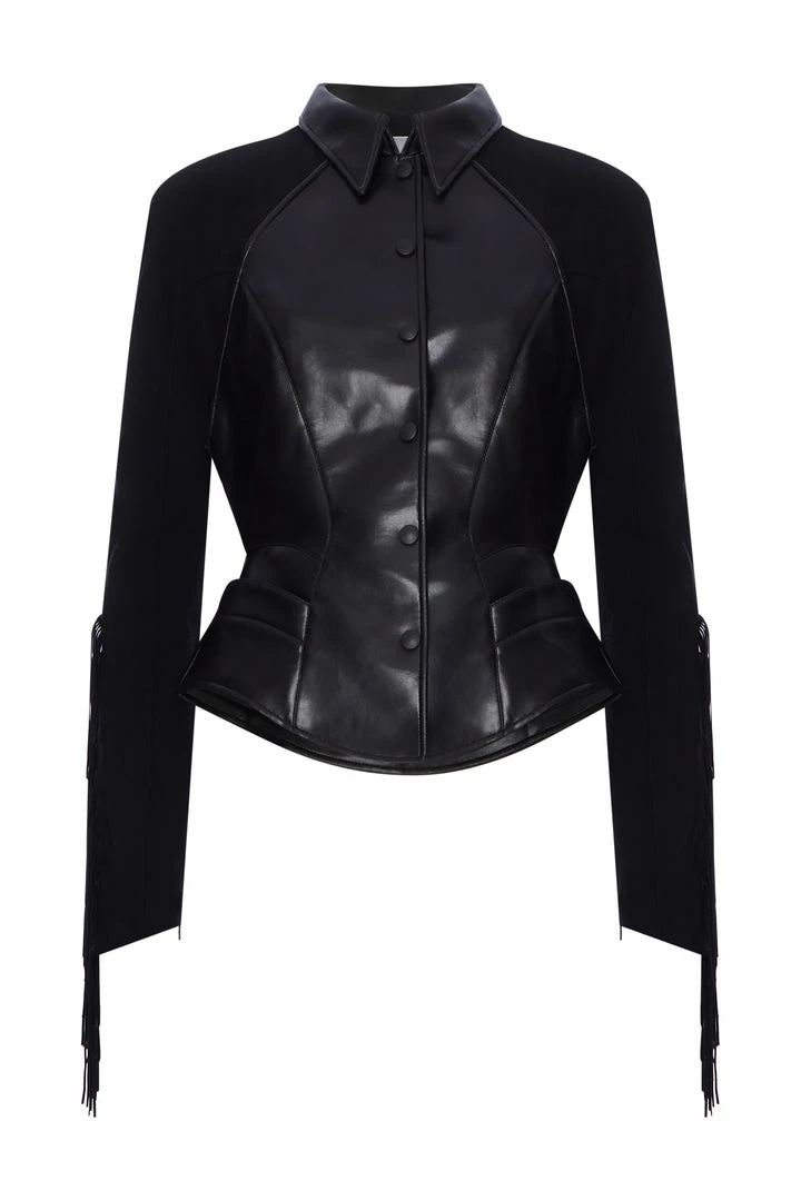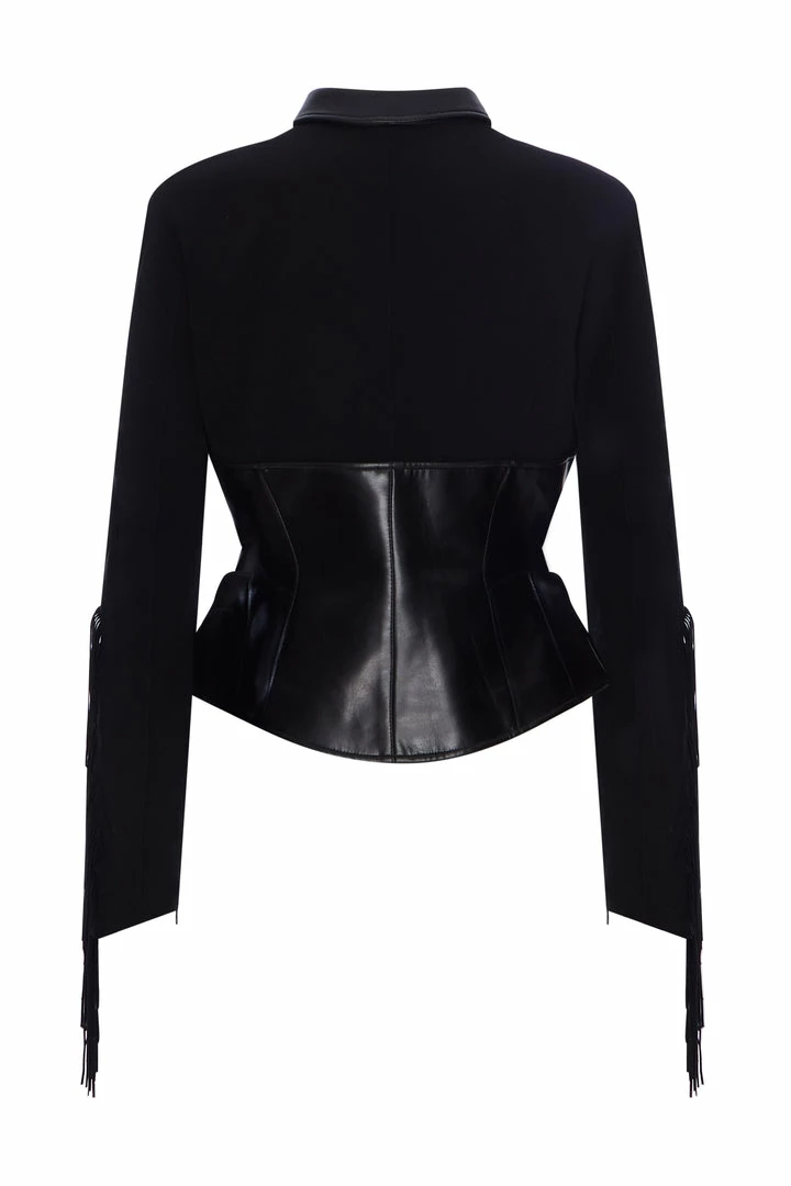 A gorgeous Thierry Mugler black vinyl and wool inserts jacket circa 1990s;Â labelled with suede fringing to sleeves, press-stud fastenings