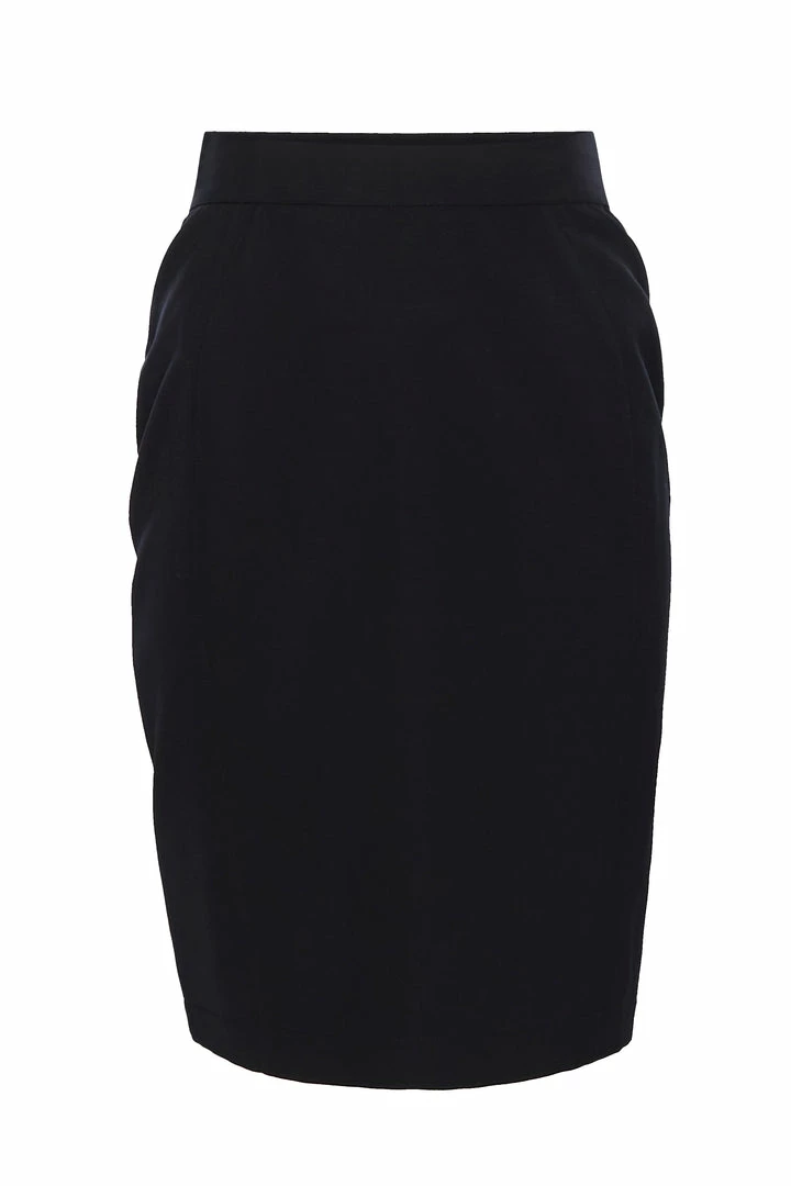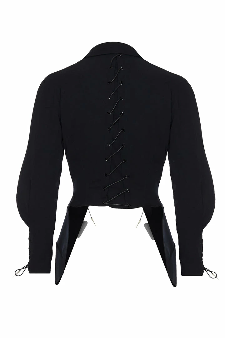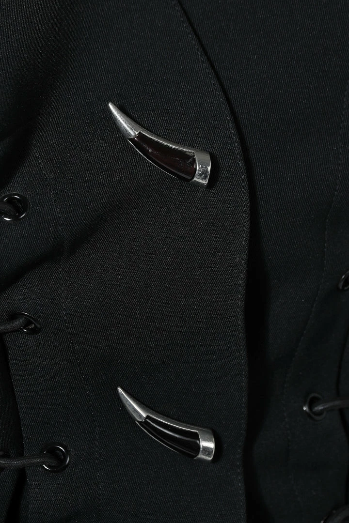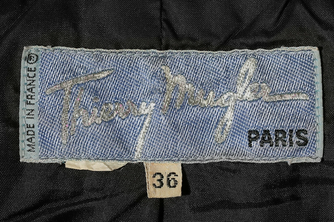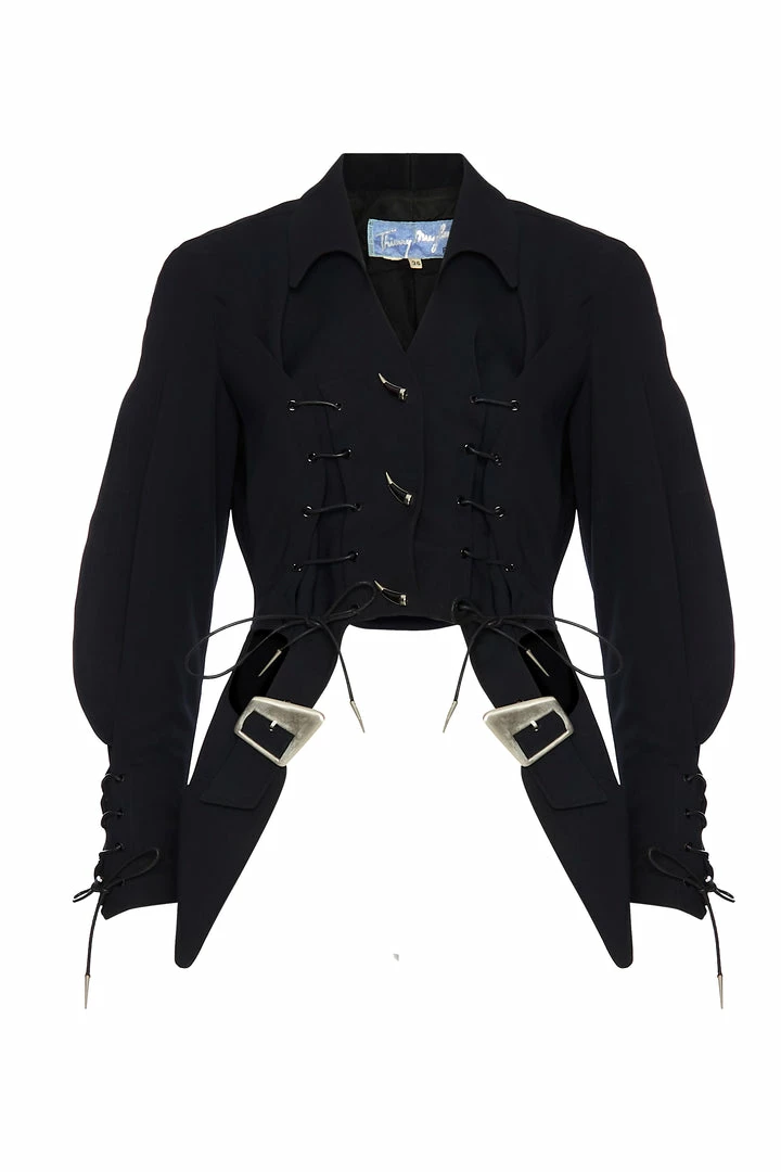 An original and rare Thierry Mugler black wool suit, circa 1994; the jacket with cut-outs and leather lacing to front, large metal buckles and ‘talon’-shaped decorative toggles; labelled size 36