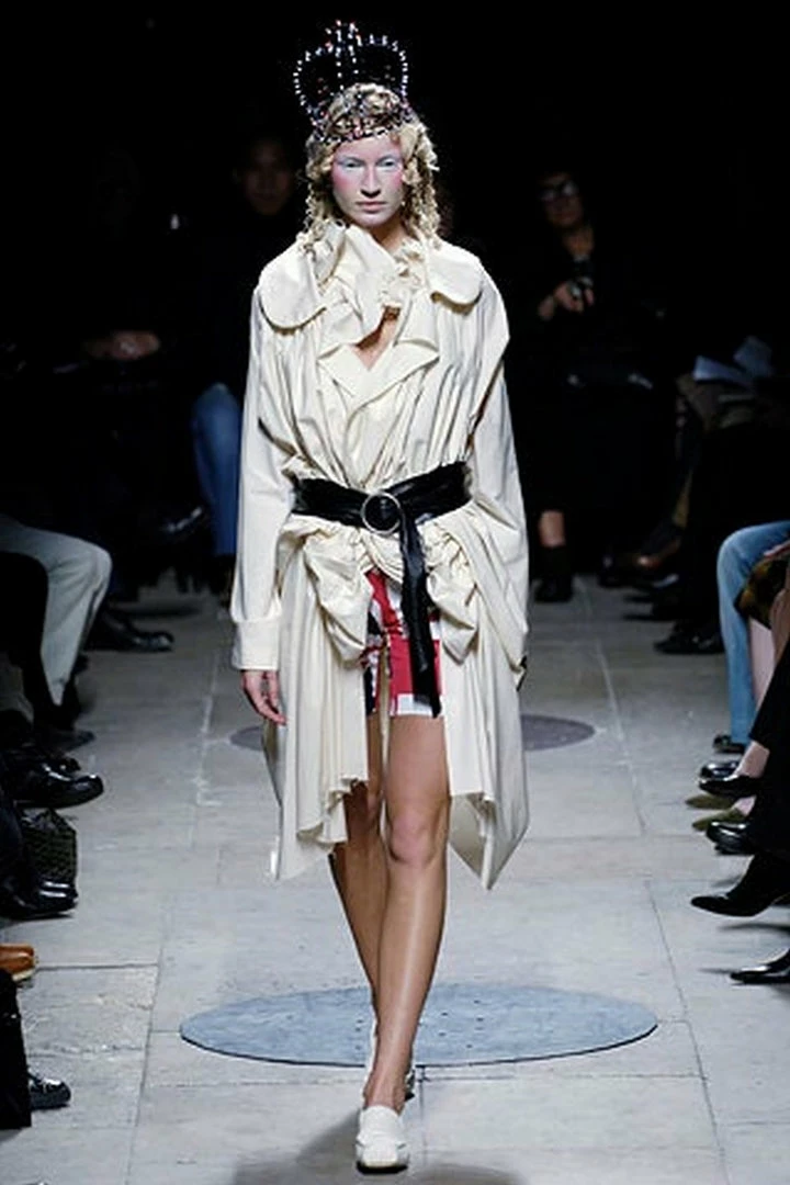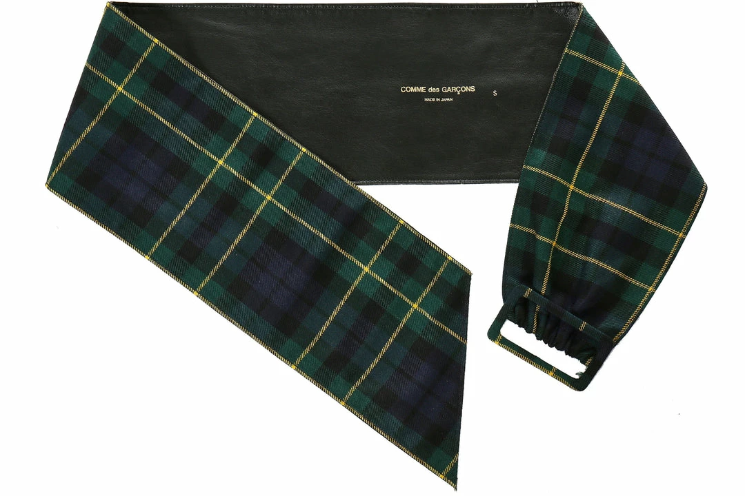 The coat was look no.16 on the runway for this collection. This exact belt cannot be seen, however tartan and variations of such belts are featured heavily. Sarah Mower writes for Vogue: ‘Usually you count on a Comme des Garçons show to plumb mysterious depths, but for spring, the mystery was slap-bang there on the surface. It looked like nothing so much as an homage to Vivienne Westwood’s royal collections. Ringleted girls in crowns, wearing Union Jack-printed underwear and punkish tartans, proceeded up and down the runway to the strains of Coronation marches, Church of England hymns, and even, gorblimey, “Land of Hope and Glory.” It was all—and this was the shock in this house of intellectual subtlety—puzzlingly literal’. Perhaps even more puzzlingly, Kawakubo dismissed the suggestion that the collection was an homage to England or Vivienne Westwood, conceding that whilst there were references to ‘a lost Empire’, the collection was about ‘cutting without a pattern’.