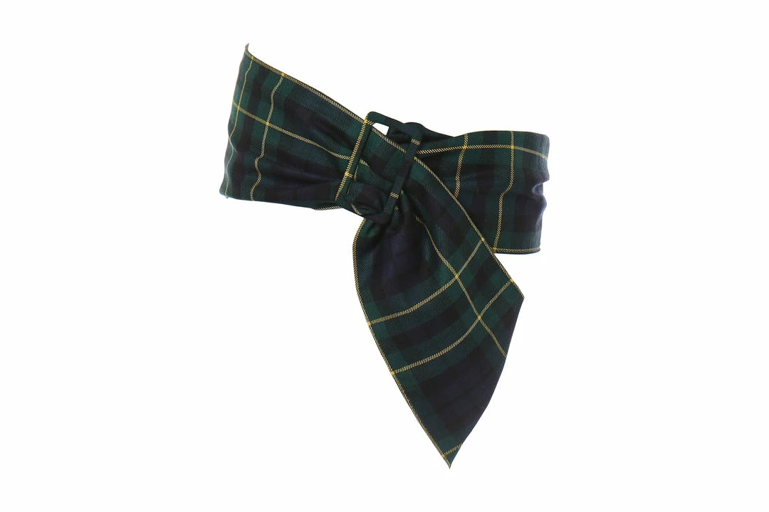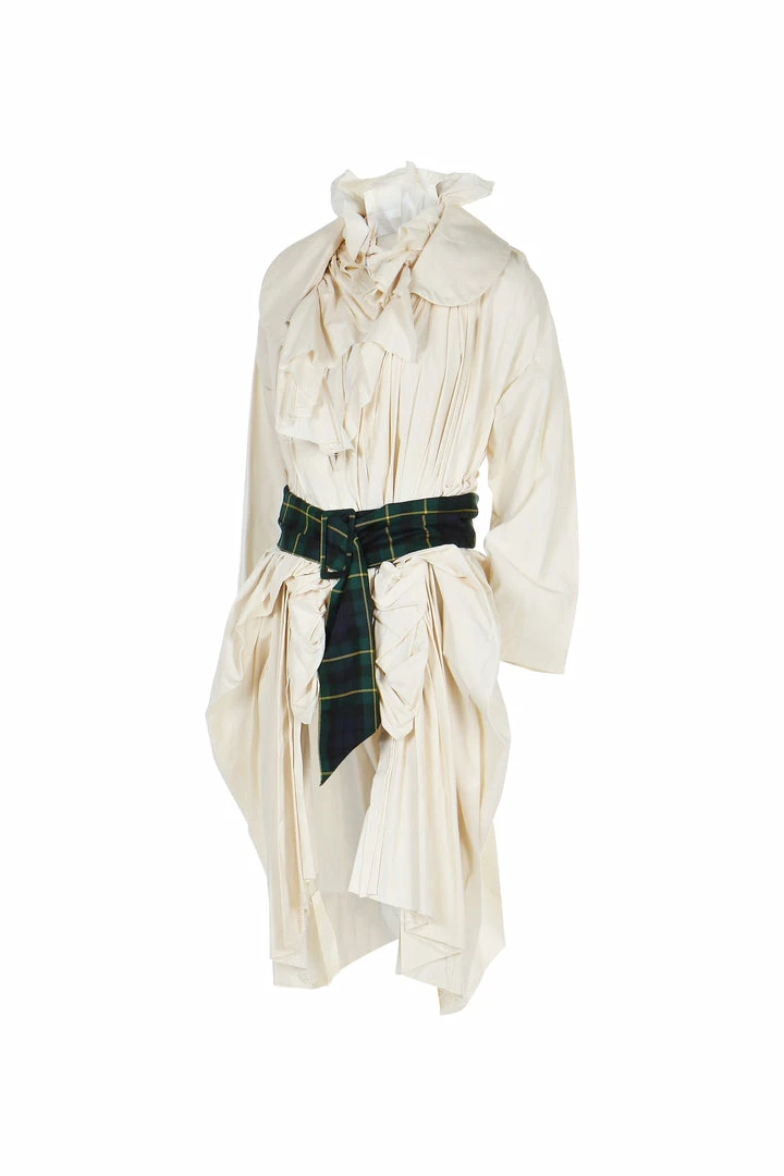 Formed from large swathes of fabric, draped, ruched and gathered, oversized Peter Pan collar; together with a Comme des Garçons wide tartan belt, from the same collection.