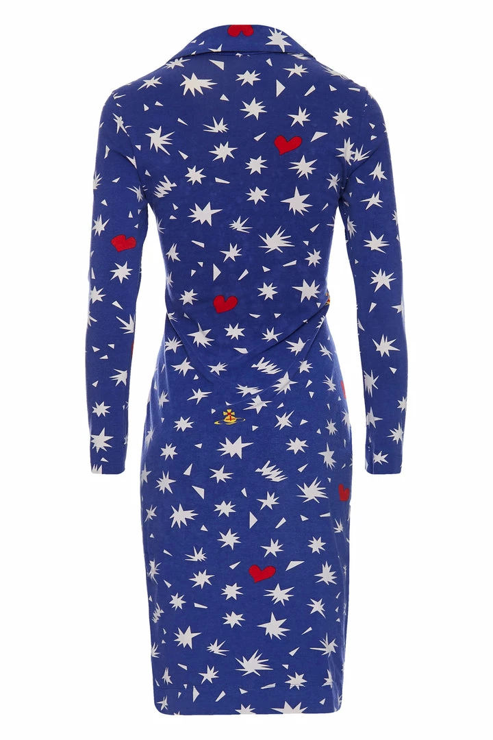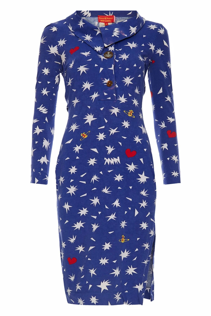 Funky daytime Westwood cotton long sleeved dress; Red Label; with signature Orb motif button; stars and squiggles illustration; asymmetrical Peter Pan collar
