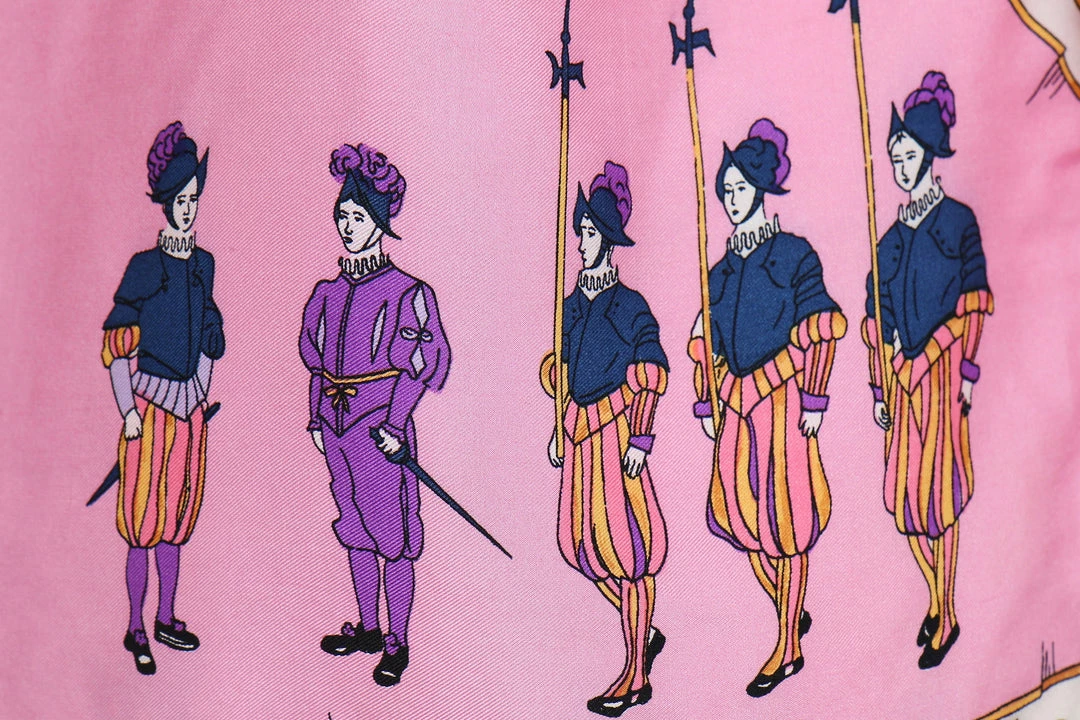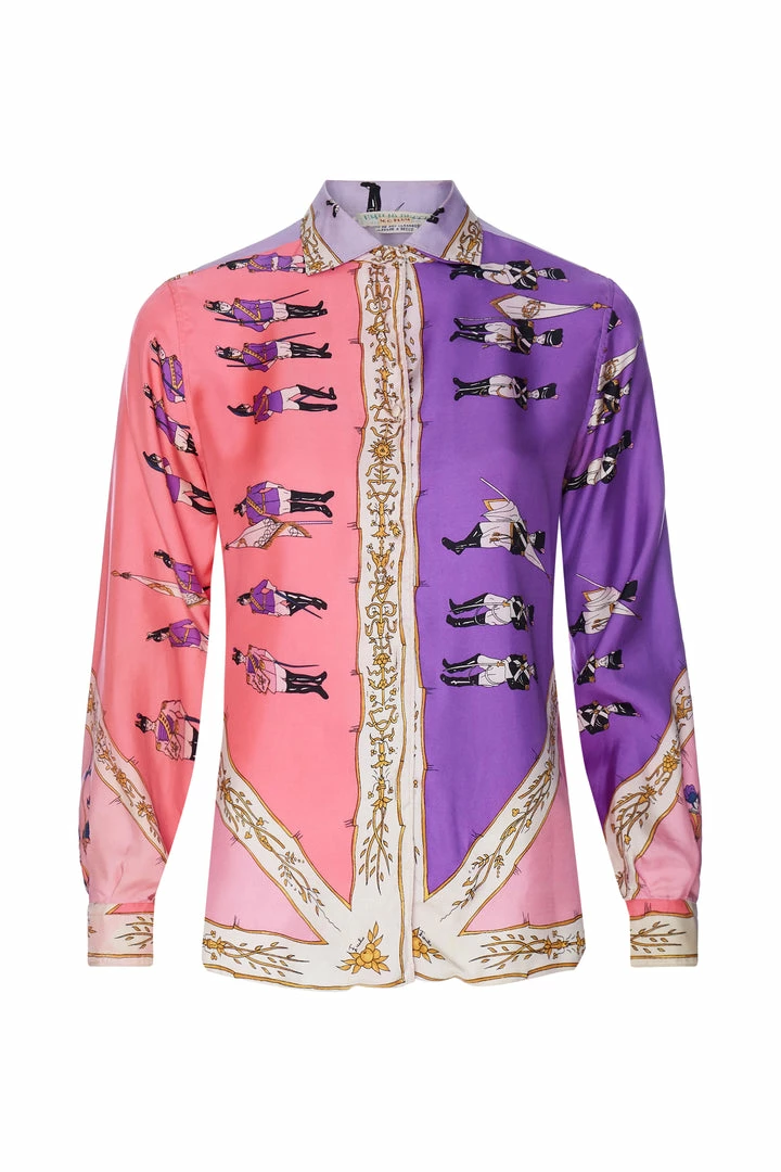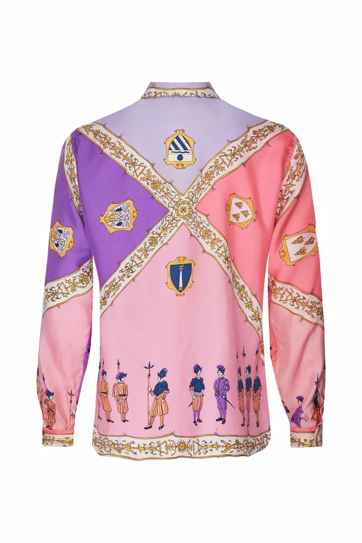 A beautiful Emilio Pucci printed Swiss guards button down shirt in pink and purple hues