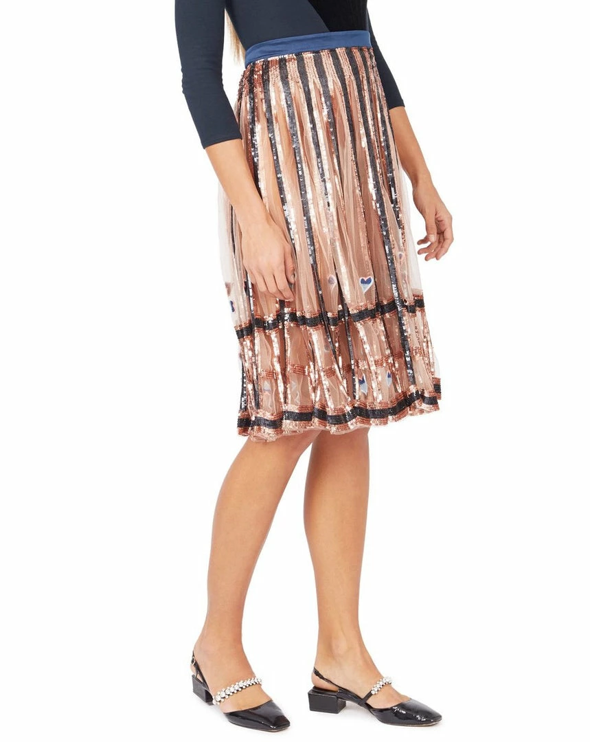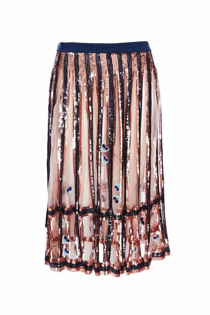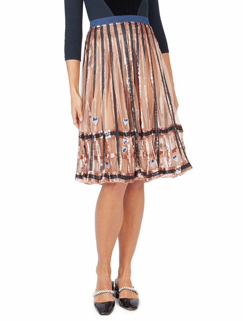 Adorned with a geometric framework of embroidered bands and a delicate embroidery of cyclamen flowers, the skirt is designed at midi length A-Skirt. Featuring an all-over mesh paneling with lining, its conceal-reveal element makes it a mesmerising evening option.