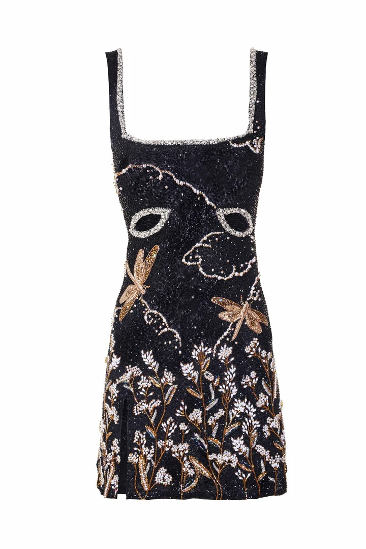Dancing Dragonfly takes you on a flight through the night with golden beaded dragonflies zipping through the garden. The bottom demonstrates blossoming tall stemmed flowers catching the light of the moon. The dress exhibits two slight slits at the ribs that are then further embellished with white and silver crystal and beads.Â