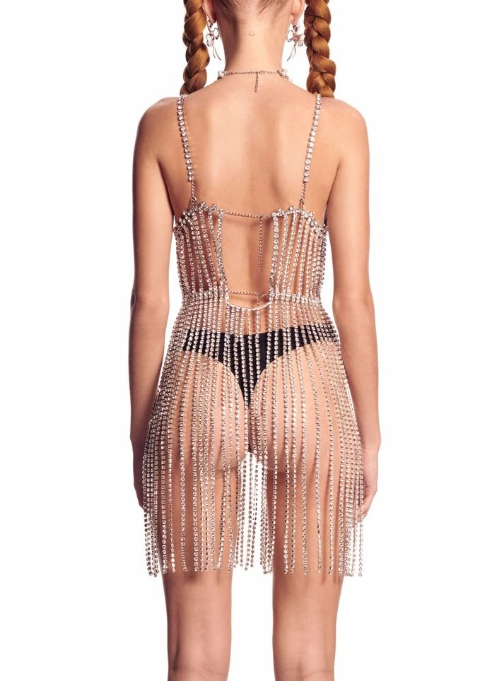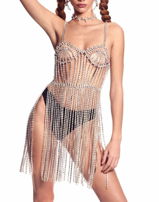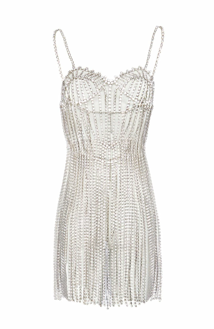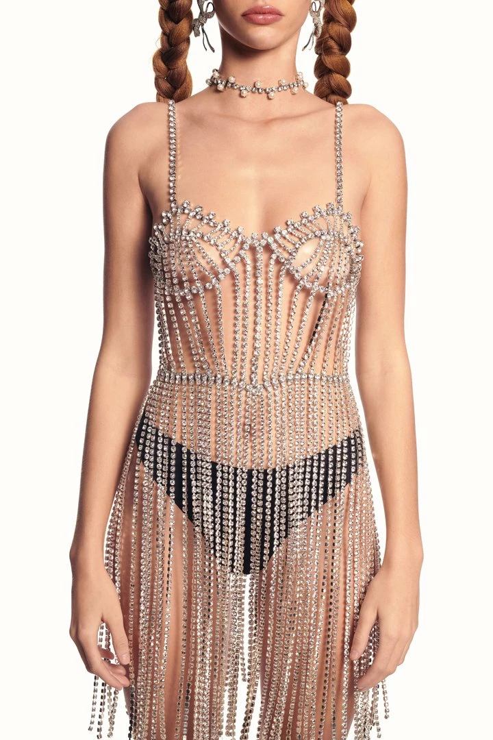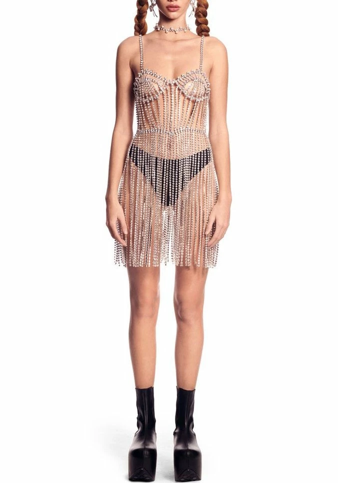 CRYSTAL CUP-CHAIN BUSTIER DRESS. FEATURES ADJUSTABLE STRAPS AND CINCH-ABLE WAIST. AVAILABLE IN CLEAR/SILVER.Â