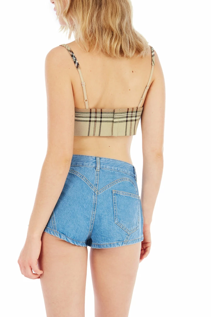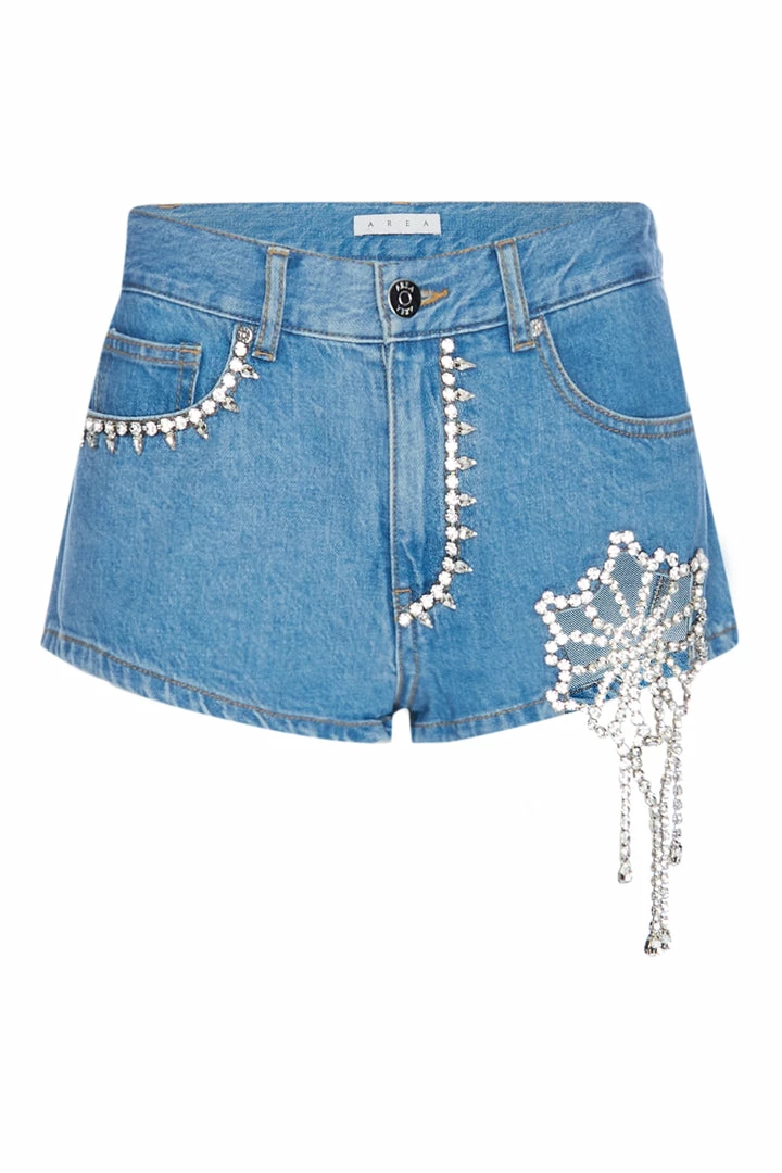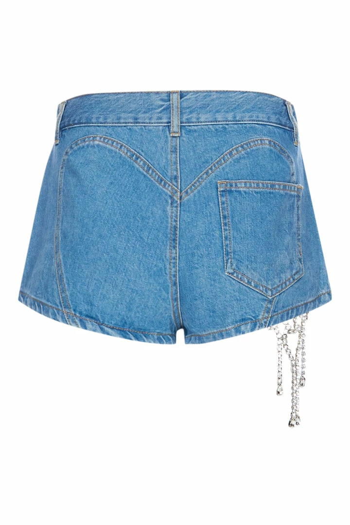DENIM HOT SHORT WITH CRYSTAL CROCHET CUTOUT. FEATURES ZIP FLY AND TOP BUTTON CLOSURE AT CENTER FRONT. AVAILABLE IN INDIGO.