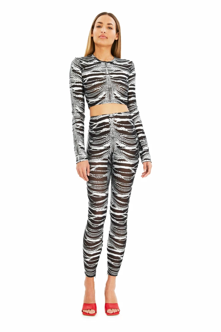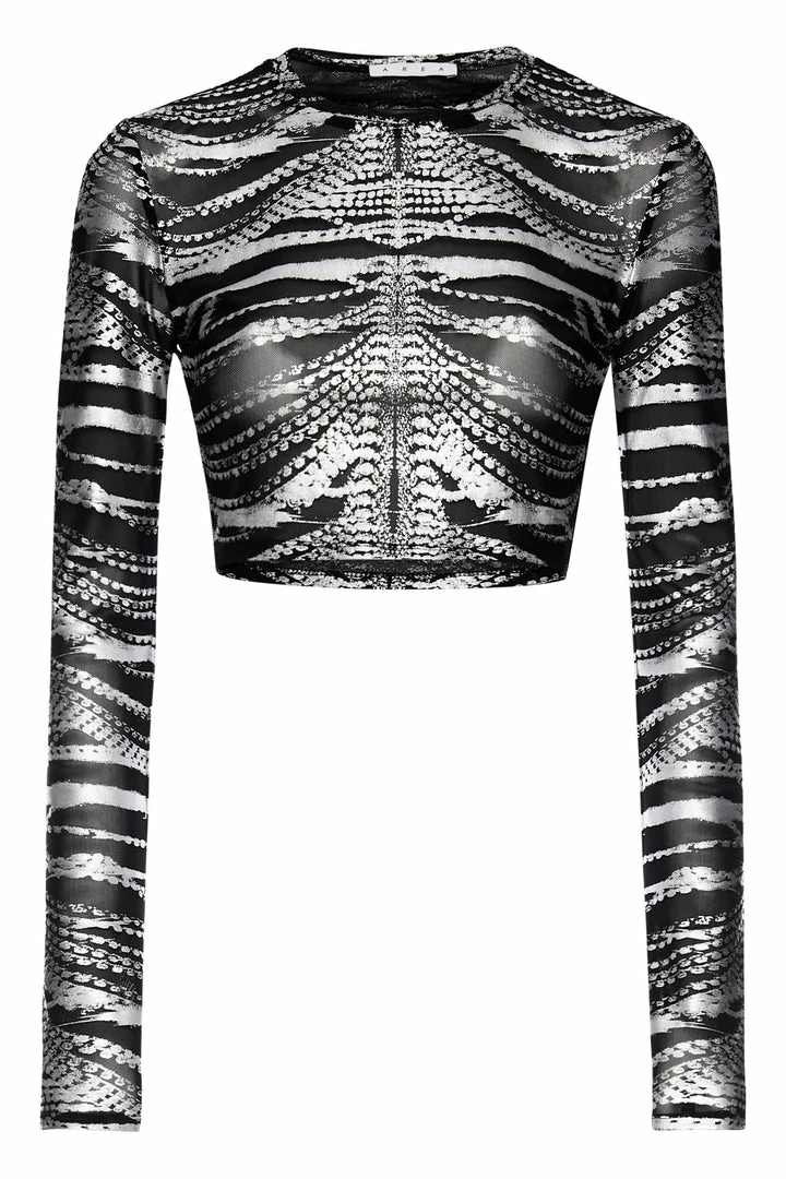 MESH LONG-SLEEVE CROP TOP WITH CRYSTAL CUPCHAIN FOIL SCREEN-PRINT. AVAILABLE IN BLACK.