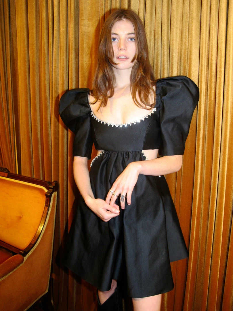 Area debuts innovative, unexpected silhouettes for FW ’20, shown in this satin mini dress. It’s designed with exaggerated sleeves and crystal-embellished trims. It nips in at the waist to flatter your figure and flares out at the a-line skirt. Team with sky-high platforms for your next party.