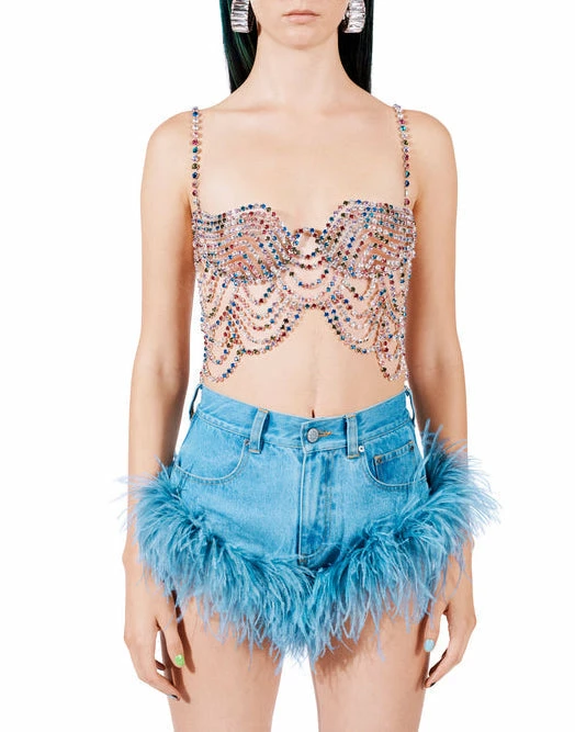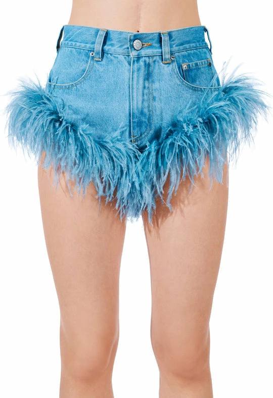 DENIM HOT SHORT WITH IMPORTED FEATHER. FEATURES ZIP FLY AND TOP BUTTON CLOSURE AT CENTER FRONT.