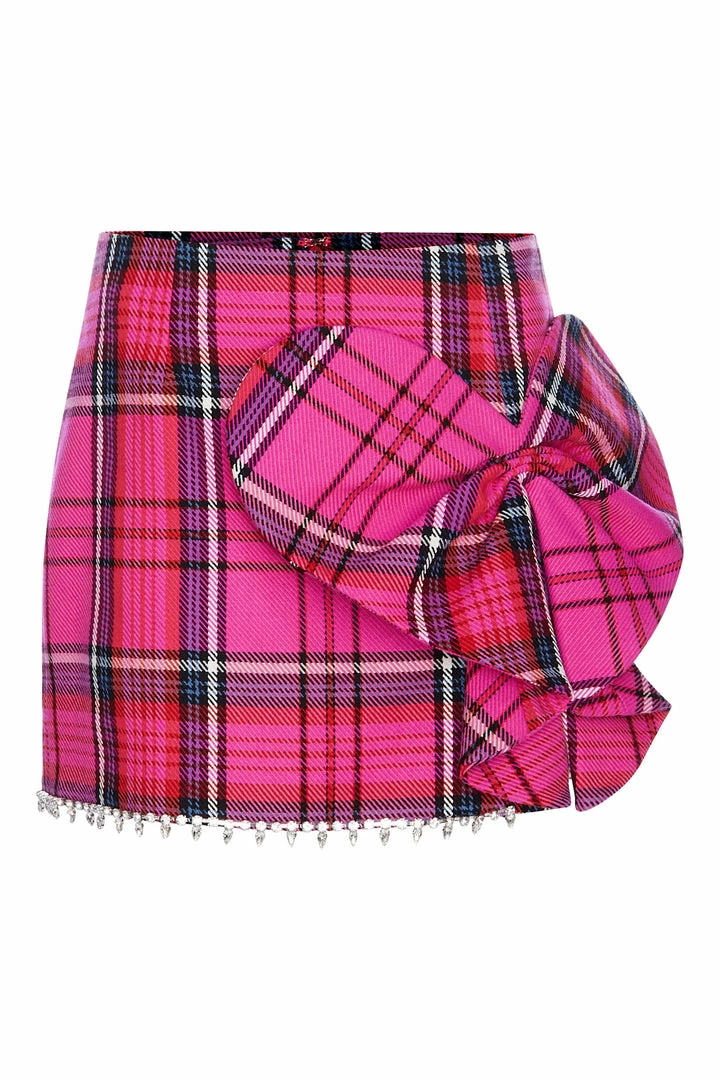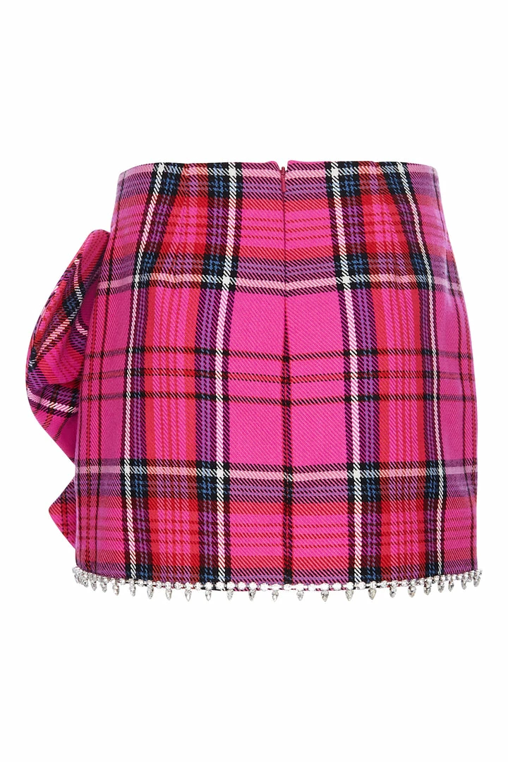 TARTAN SUITING HEART BOW MINI SKIRT WITH CRYSTAL TRIM AND SLIT AT HEM. FEATURES INVISIBLE ZIP CLOSURE ATÂ CENTER BACK. AVAILABLE INBEIGE PLAID.