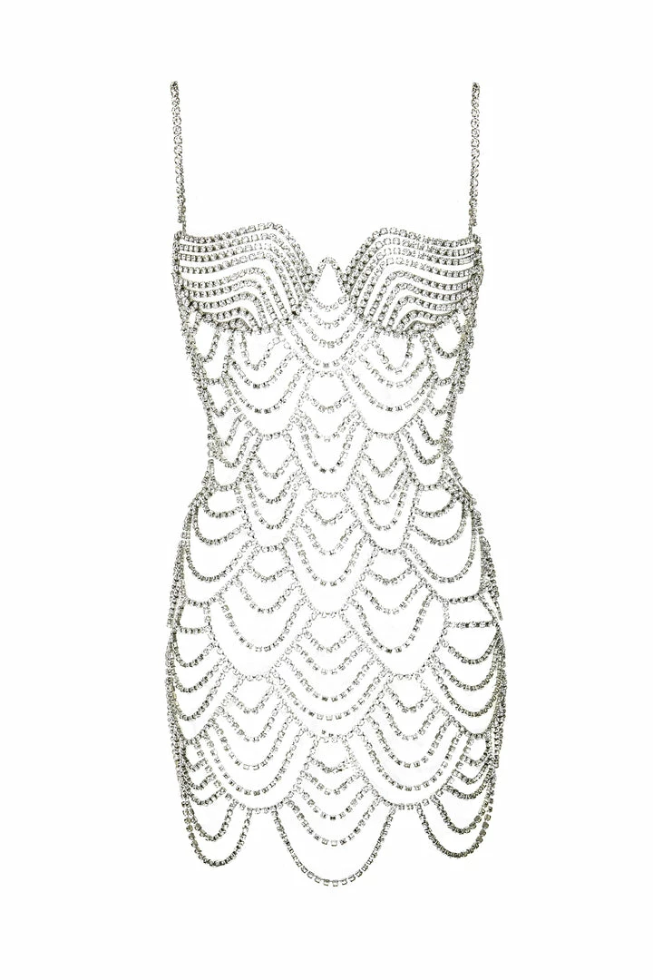 CRYSTAL CUP-CHAINÂ SCALLOPEDÂ DRESS. FEATURES ADJUSTABLE STRAPS AND CINCH-ABLE WAIST