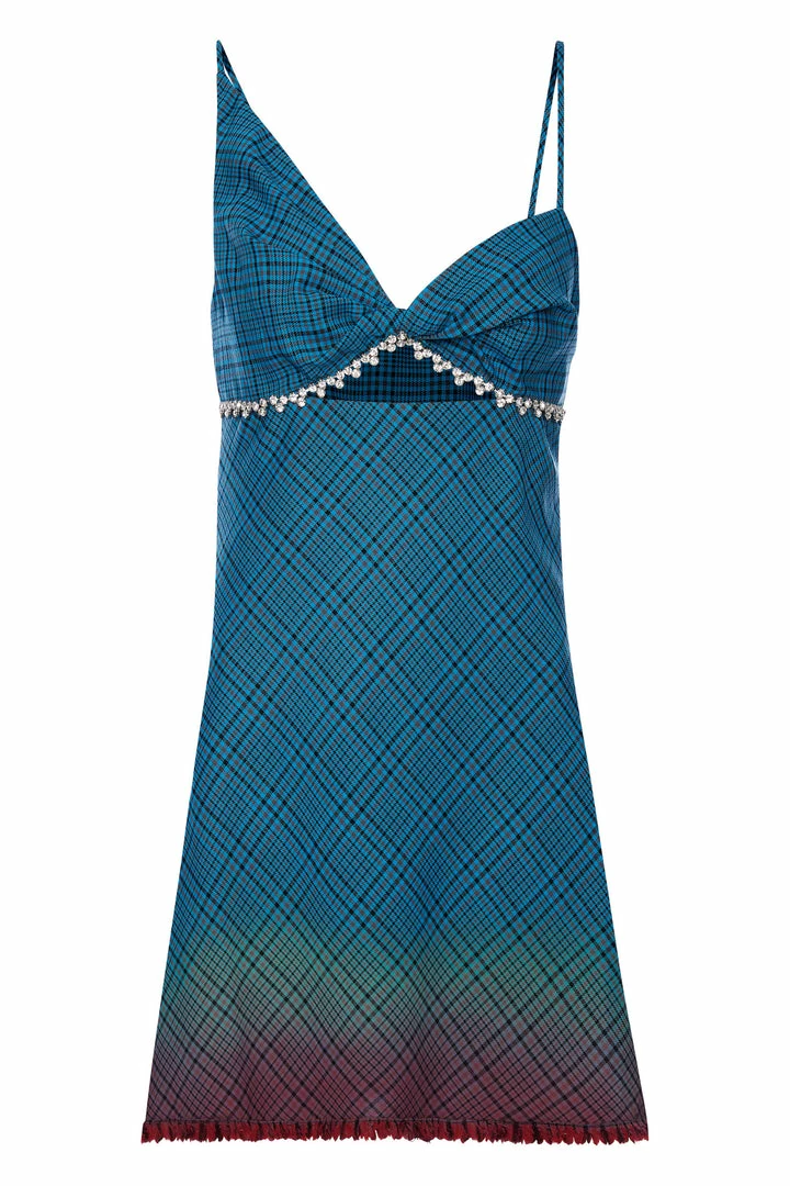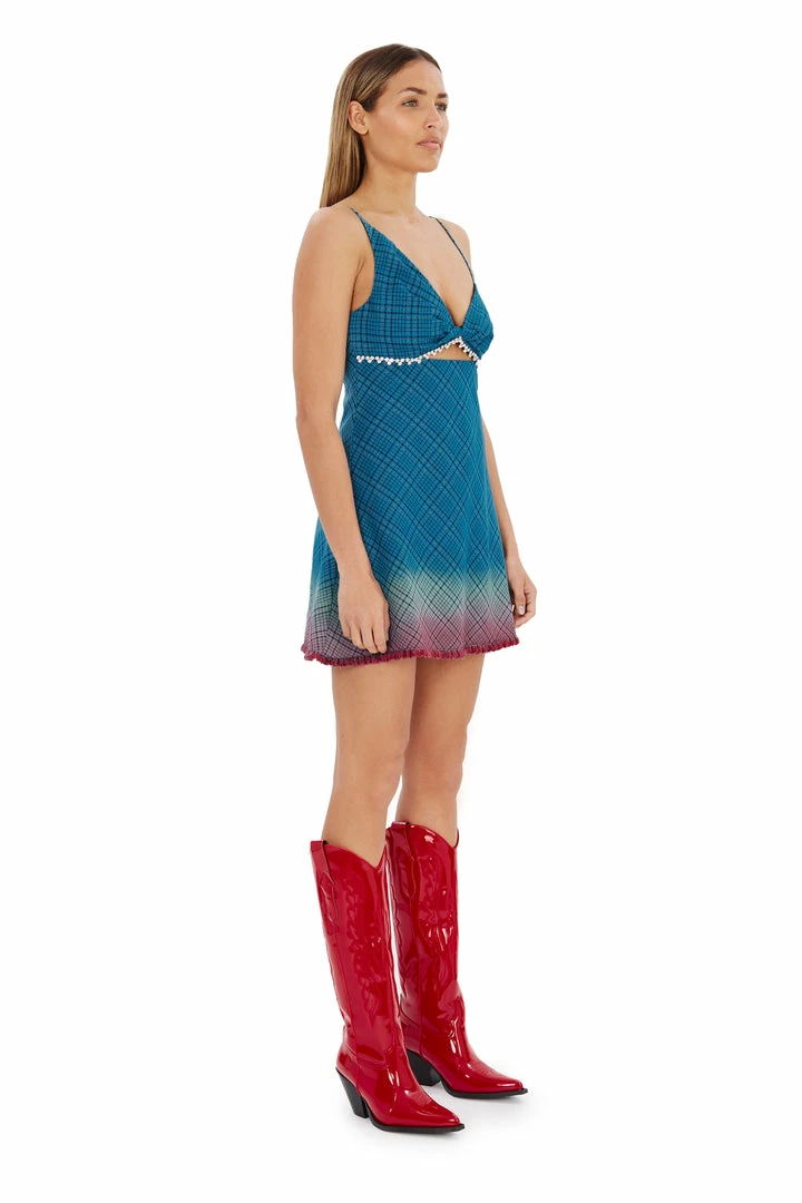 LIGHTWEIGHT SUITING DIP-DYED BIAS MINI DRESS. FEATURES TWISTED CUP DETAIL & HIDDEN ZIP AT SIDE SEAM. AVAILABLE IN AQUA OMBRE.