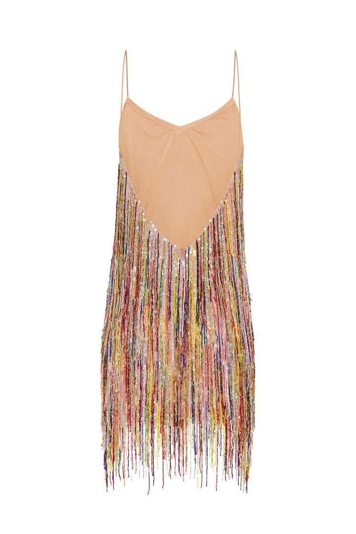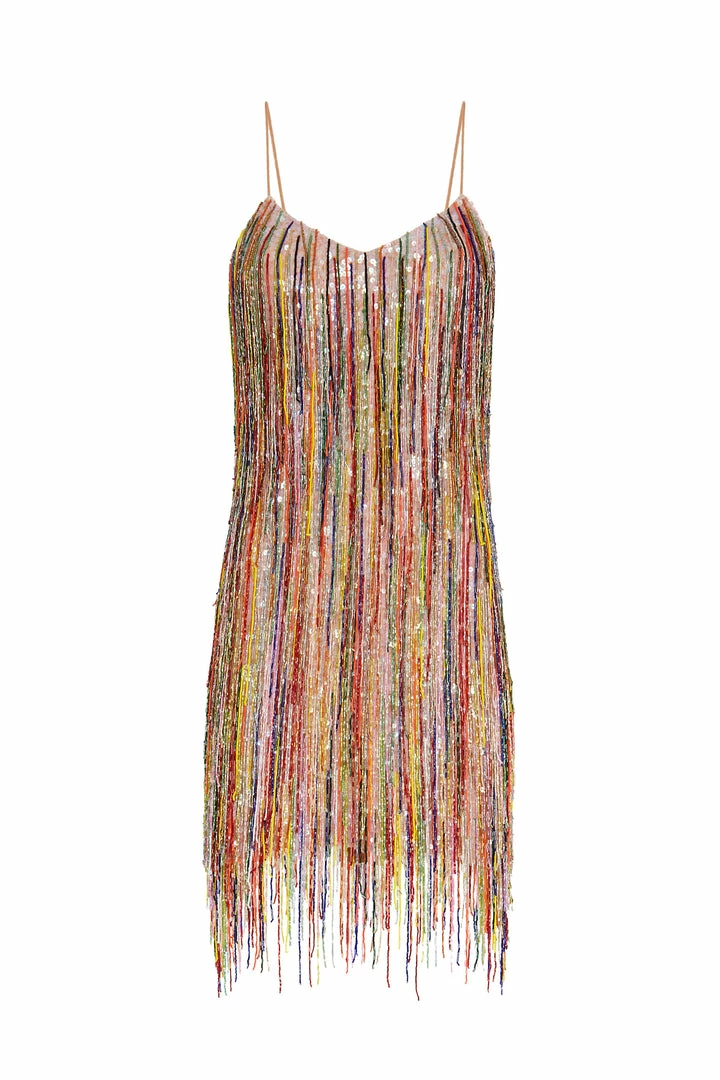 Fun and flirty. Ashish Gupta better known as the king of sequin is back this season with this beautiful rainbow beaded fringe mini dress. This mini dress from Ashish is covered with all-over rainbow beaded bringer for a unique take on a wardrobe staple. Twist and turn the night away.