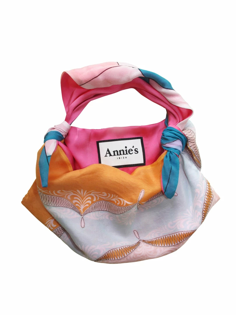 A one-of-a-kind bag made exclusively for Annie’s Ibiza from sustainably sourced vintage scarves dated from the 1970’s – 1980’s