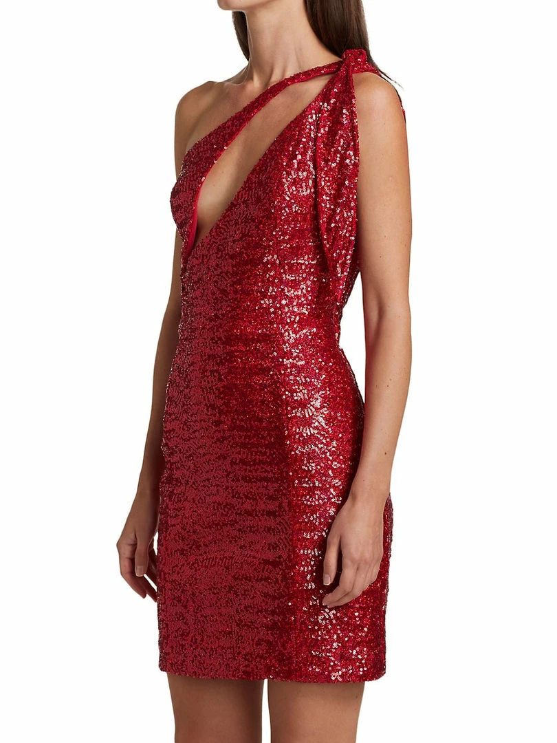 Allover sequins add liquid-like shine to this cutout minidress, styled with a chic one-shoulder neckline.