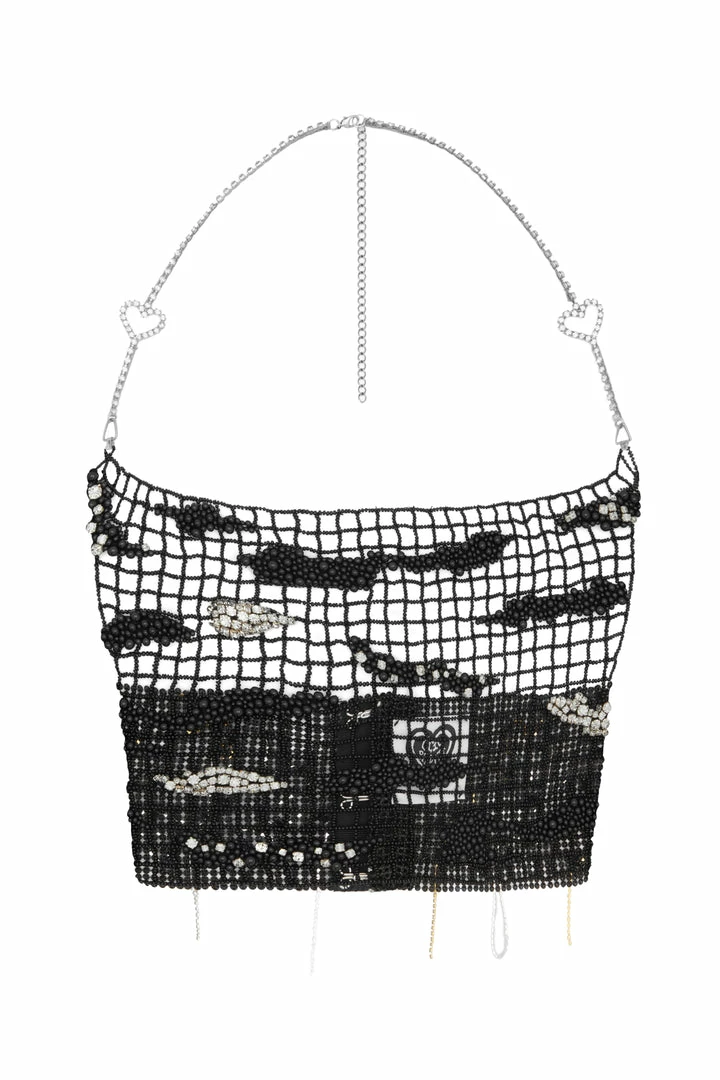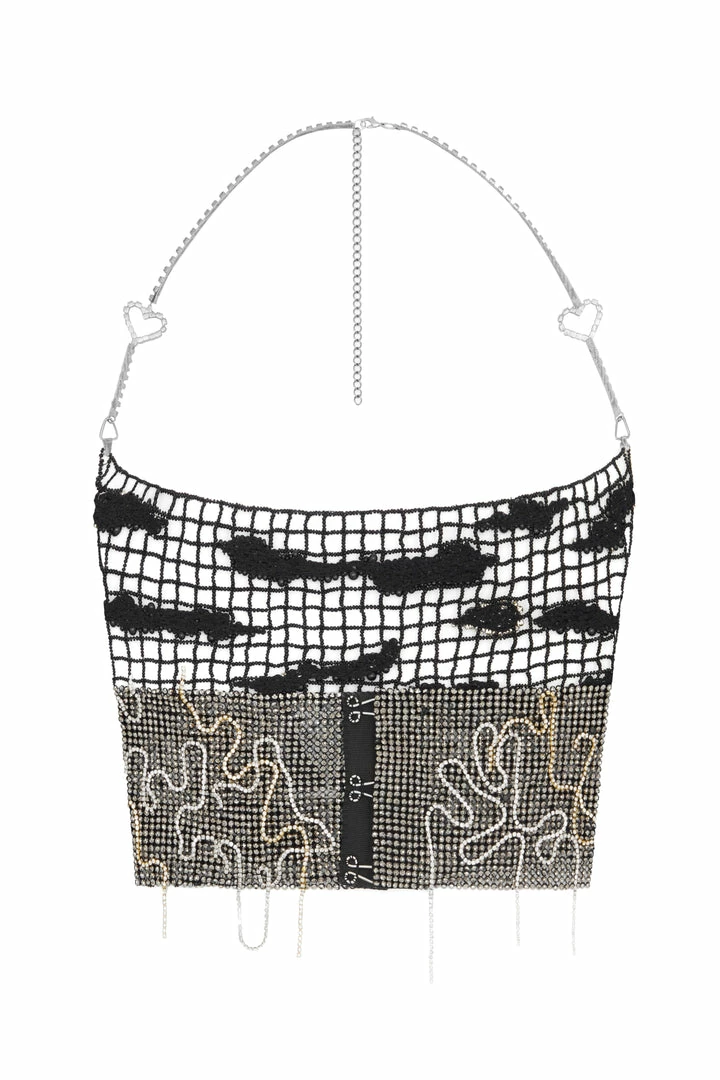 - Back panel made from embellished chainmail with large silver hook and eye closures