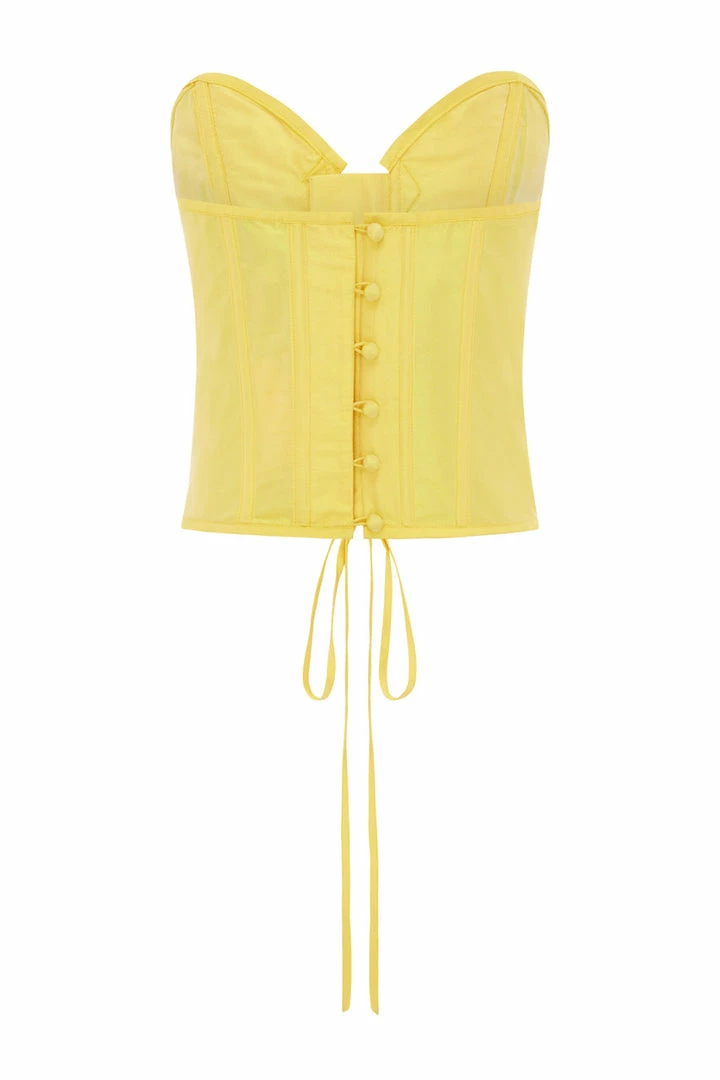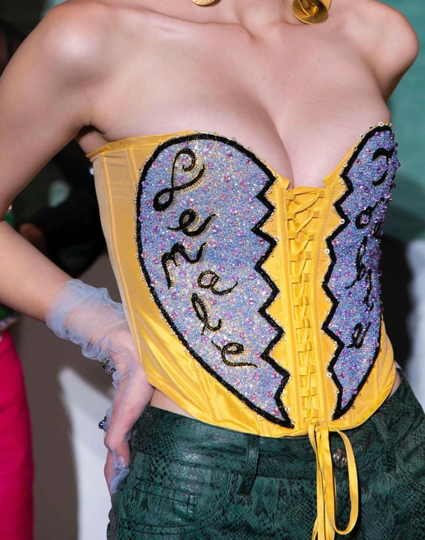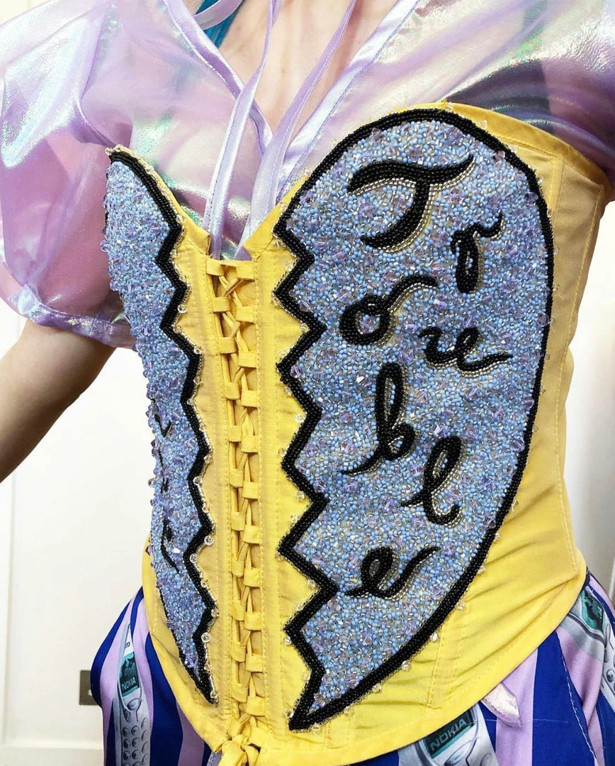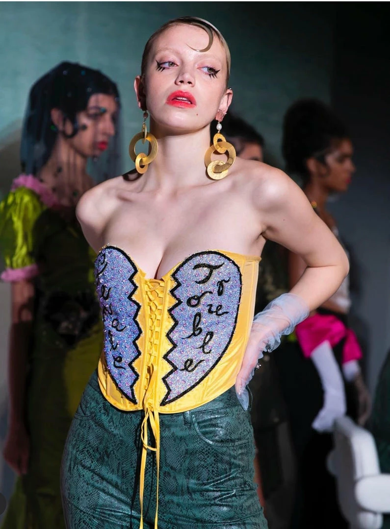 Originally inspired by John Waters’ fabulously anarchic 1974 film of the same name. With each piece taking hours of hand work, the Female Trouble Corset mixes raw silk taffeta, Swarovski and beads. Featuring a bridal corseted front, boned interior for support and self-covered buttons at back.
