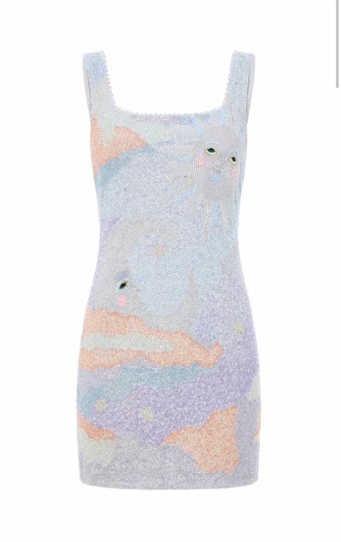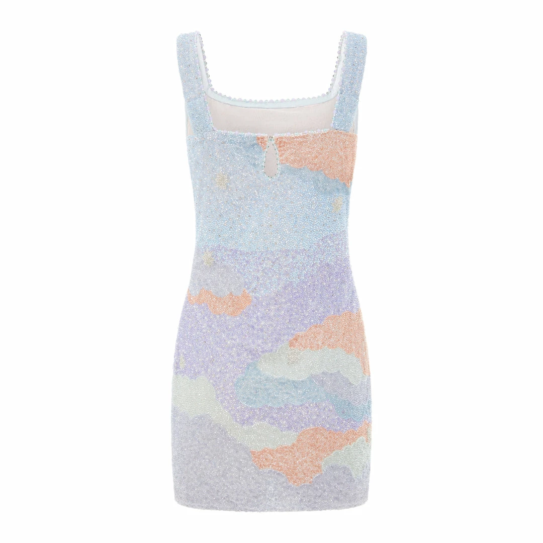 Our classic Lucina dress reimagined in powder blues and dusky lilacs with a glittering Swarovski neckline trim. Delicately hand beaded for a sparkling finish. The silhouette features a fitted body with some stretch, thicker straps and a smooth, squared neckline.
