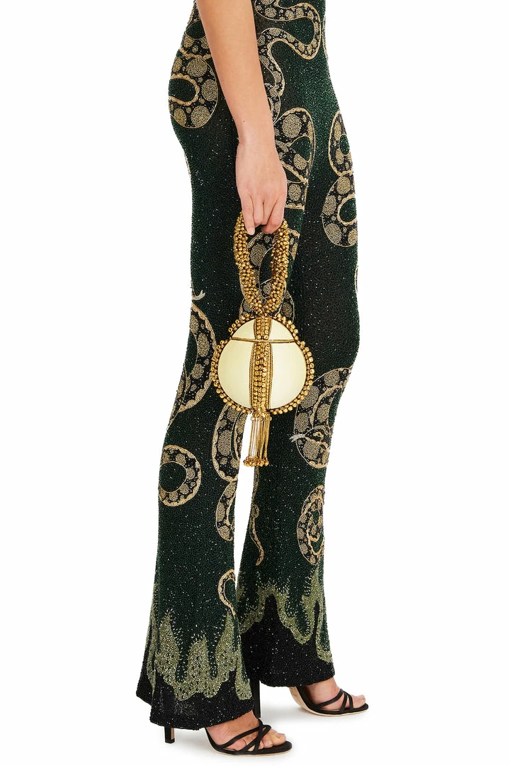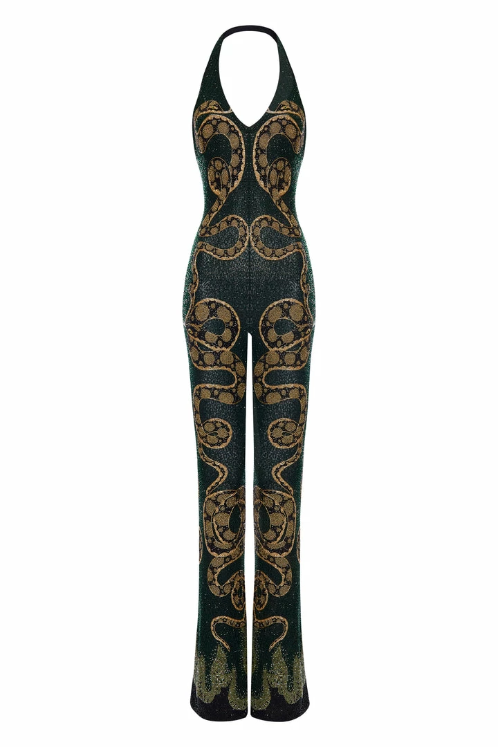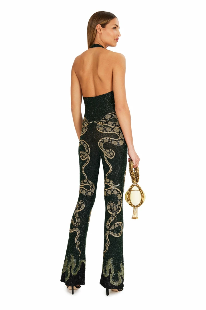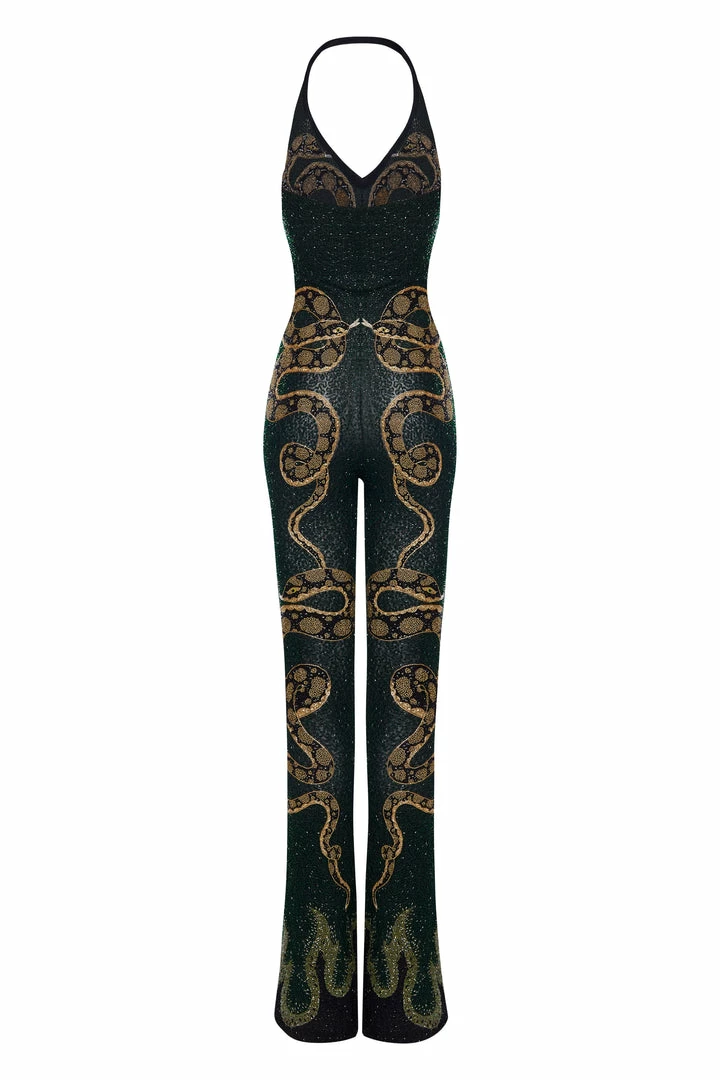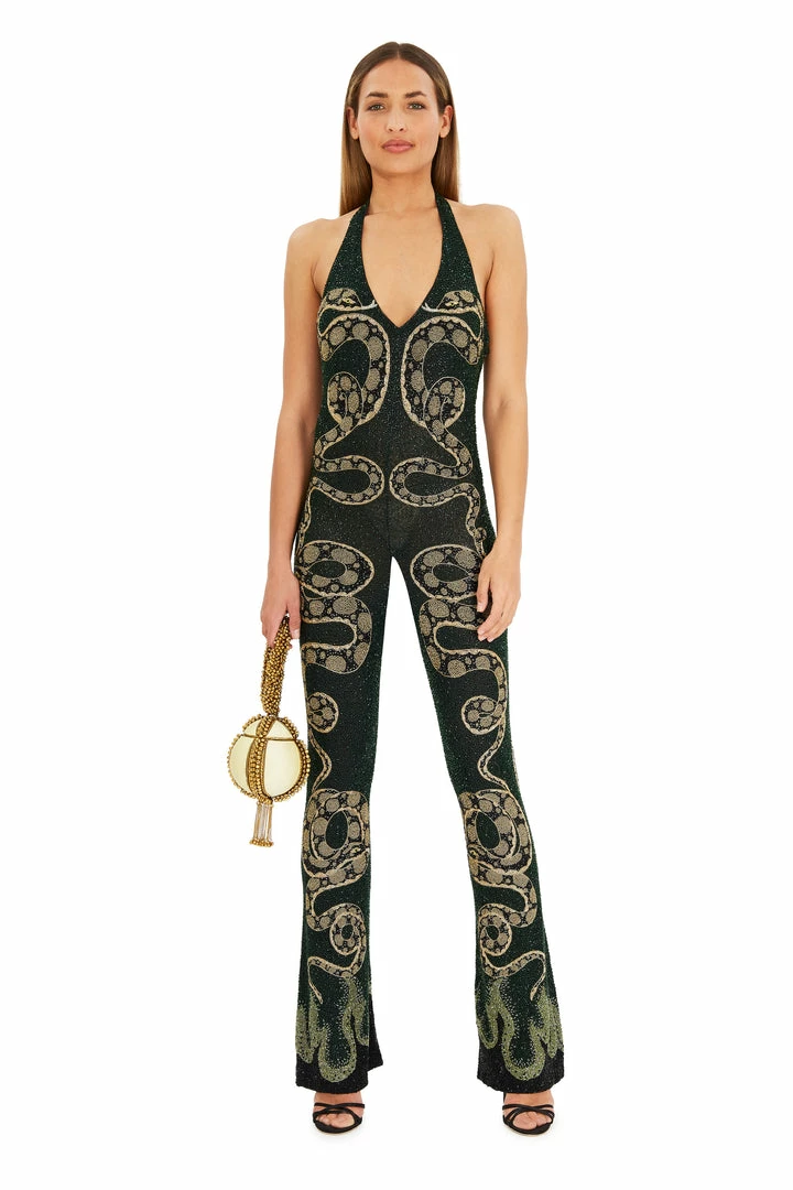 Hand-embellished gold snake imagery in rich gold and blacks. The Serpent jumpsuit is completely hand beaded onto a base of stretchy, form fitting recycled polyester and solely uses excess beads supporting a more circular economy.