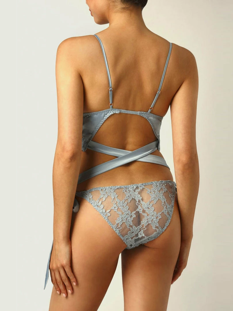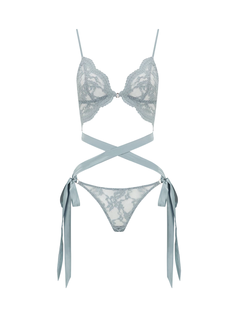 Unwrap pleasure slowly in the Viola Bodysuit, with Satin ribbons enveloping your form for a slow reveal. A soft cup triangle style bra extends down the torso in sky blue lace, meeting silky satin fabric to the reverse. Crossing satin ribbons extend around the torso, forming adorable oversized bows as they reach the brief. The knicker section is suggestively sheer, with nothing but sky blue lace covering you. A simple clasp reveals all to the front of the bra, allowing for a slow and sensual strip when unwrapped, ribbons and all. Rose gold components are the finishing touch to bring a final dash of luxury to this show stopping piece. You’ve never known romance like this.