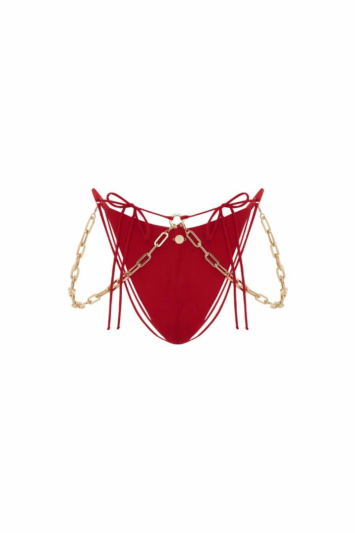 The Belly Dancer Bikini Bottom is made from smooth swimwear fabric. The high-rise briefs have slim straps on the sides as well as detachable straps that goes around the bottom and ties at the back. It’s finished with gold chain side straps that are detachable. It comes in black, red, pink, yellow and peach