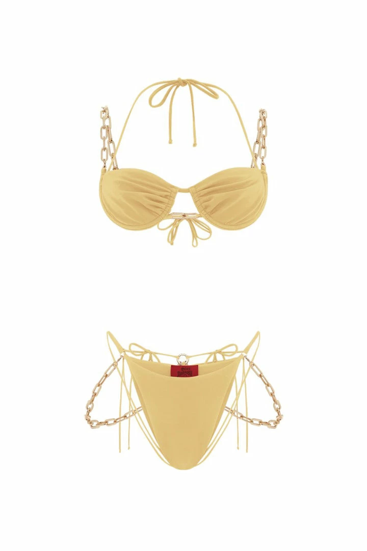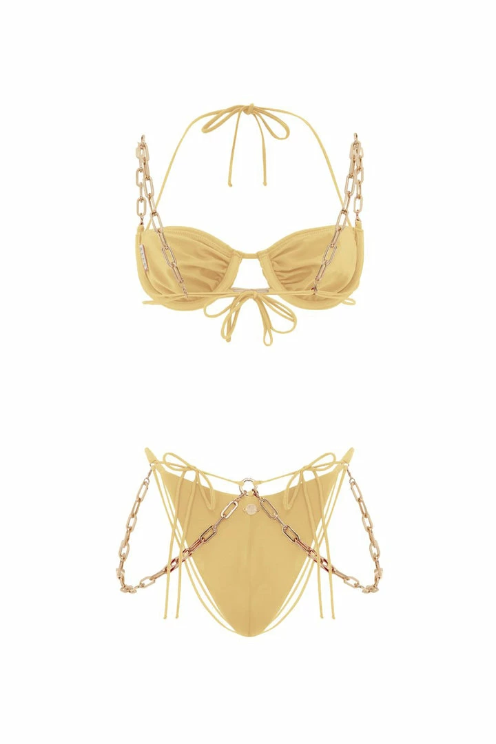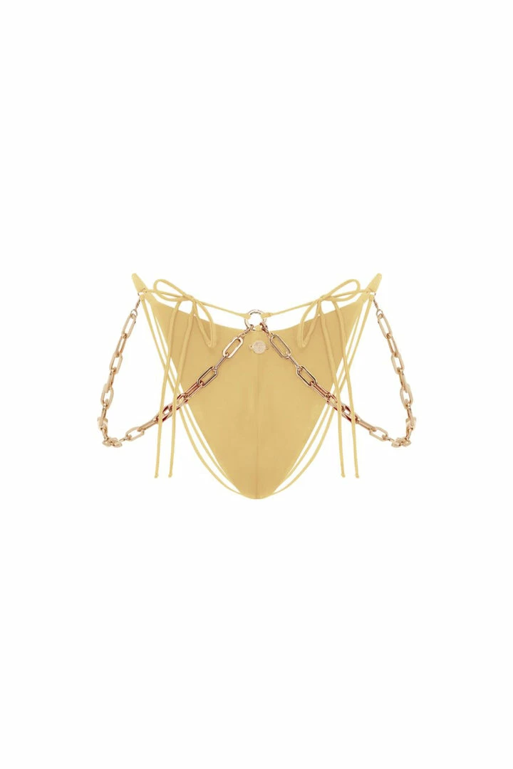 The Belly Dancer Bikini Bottom is made from smooth swimwear fabric. The high-rise briefs have slim straps on the sides as well as detachable straps that goes around the bottom and ties at the back. It’s finished with gold chain side straps that are detachable. It comes in black, red, pink, yellow and peach