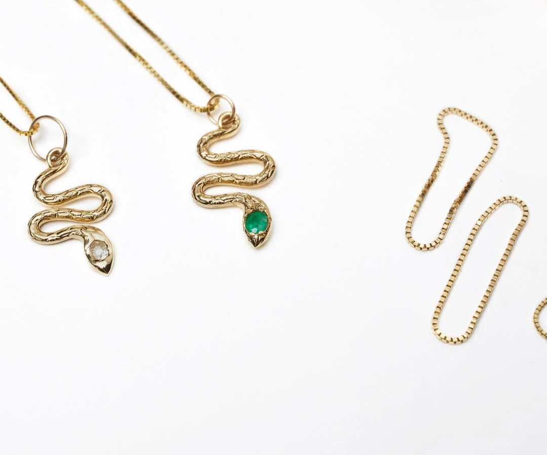 14K Solid Yellow Gold snake pendant with a Diamond eye.