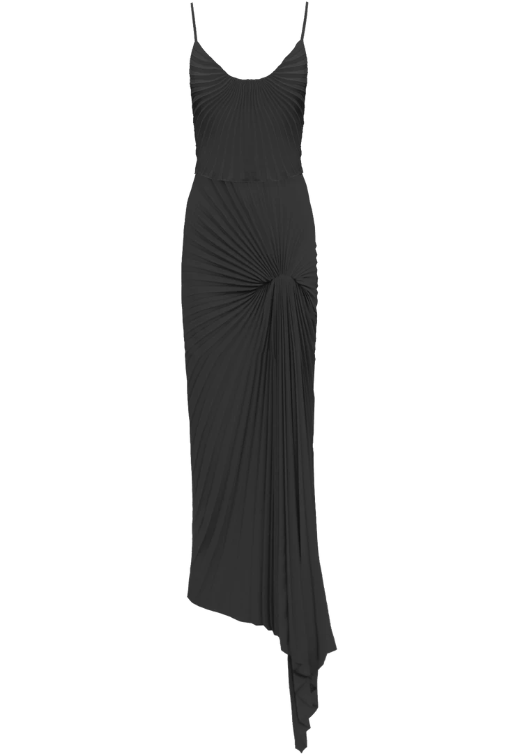 Floor Length Dress pleated all over in a sunray design with a unique gathered detail on the skirt. Strapped top half is left loose at the hem to draw the eye to the waist. A flattering draped asymmetric hemline.