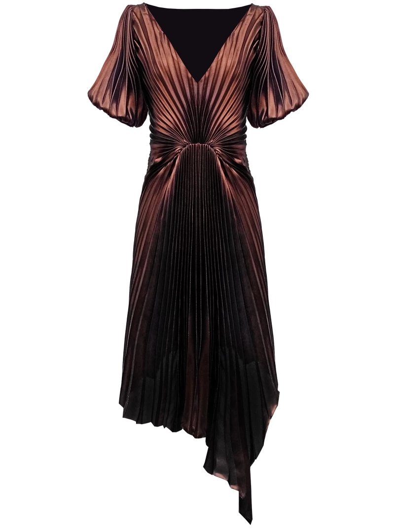 Midi Dress crafted from a soft, liquid metallic chiffon. Pleated all over in a sunray design with a unique gathered detail on the waist, draped into an asymmetric hemline. Features an open v-neckline and a small puff sleeve. Ties at the back to bring in the waist.