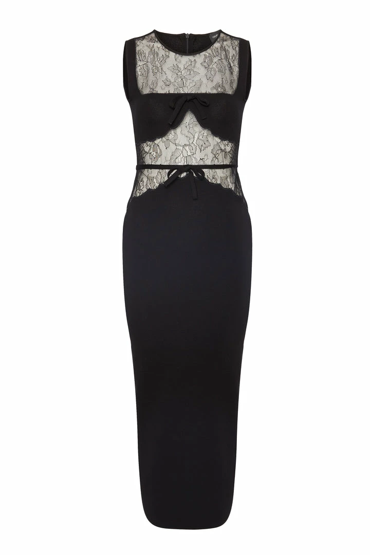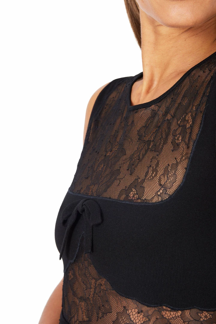 This long black knit dress is sleeveless and lace inserts that offers transparency. It has two bows on the waist and chest. It is a feminine and trendy dress.