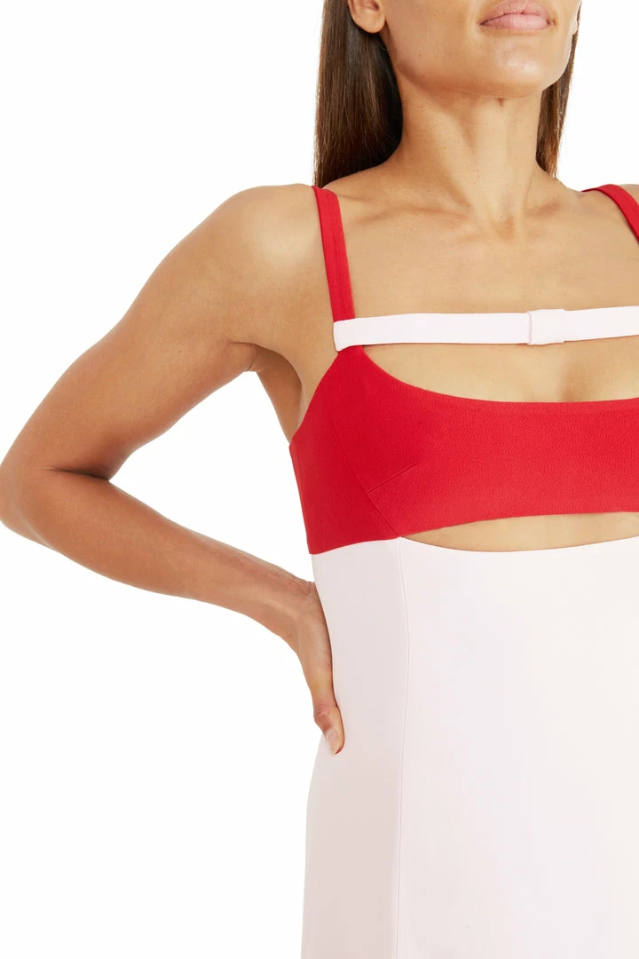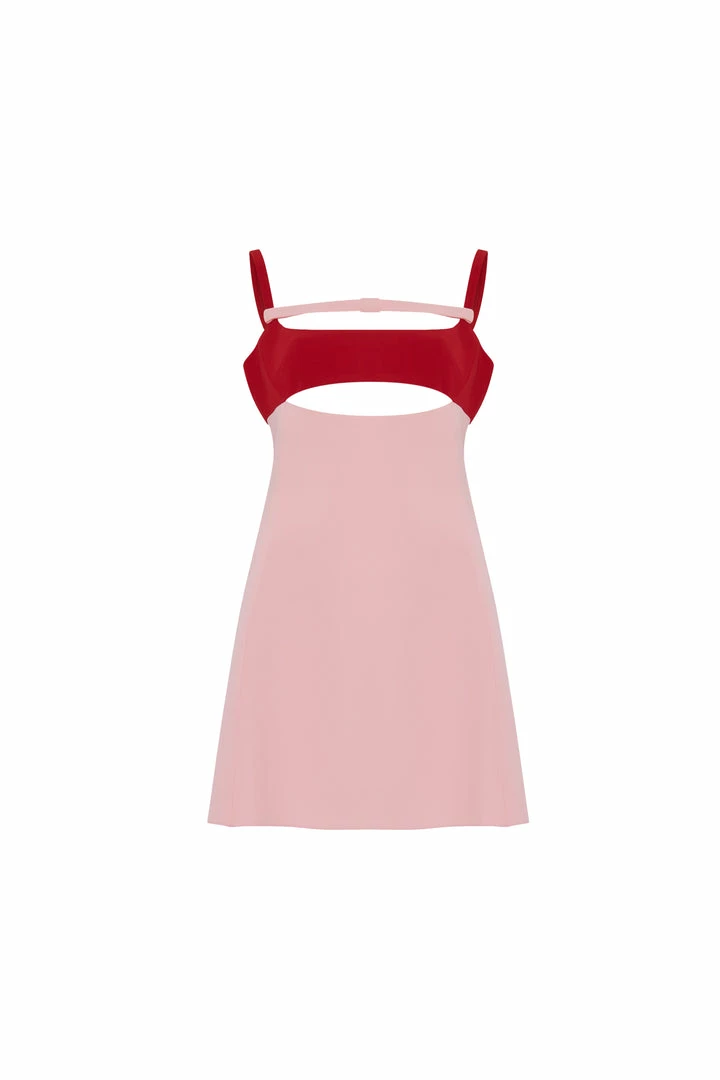 This crepe mini-dress is Pink and Red. It is sleeveless and has a round neck with a pink insert on it.