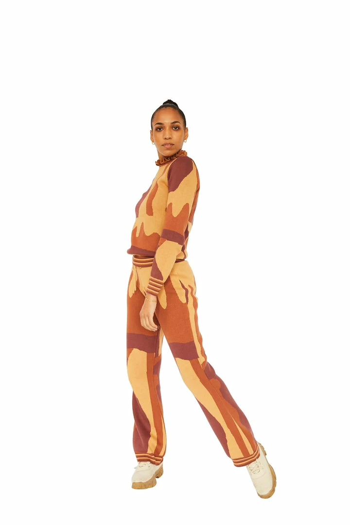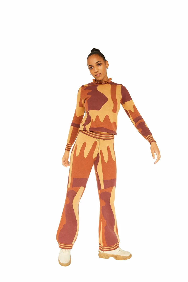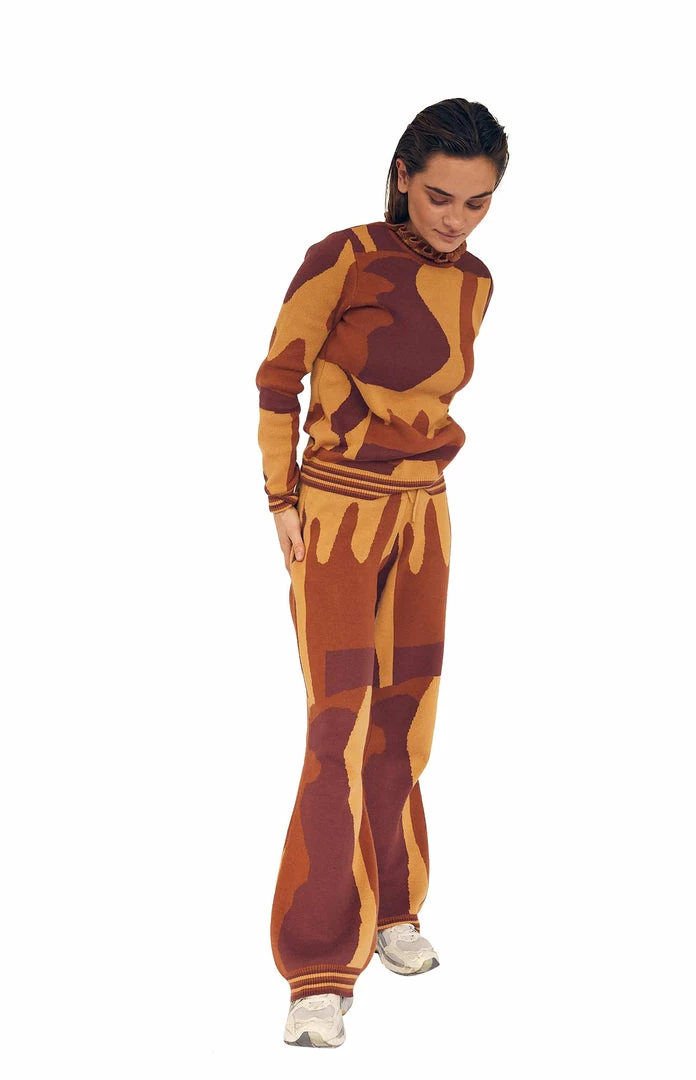 Knit trousers in 100% cotton. Jacquard knitted abstract pattern in tone on tone colors. With a tie elastic waist, a fitted silhouette, and slightly flared bottom leg, the knit trousers are suitable for a relaxed as well as a festive setting. The style is true to size & the model wears a size S/M.