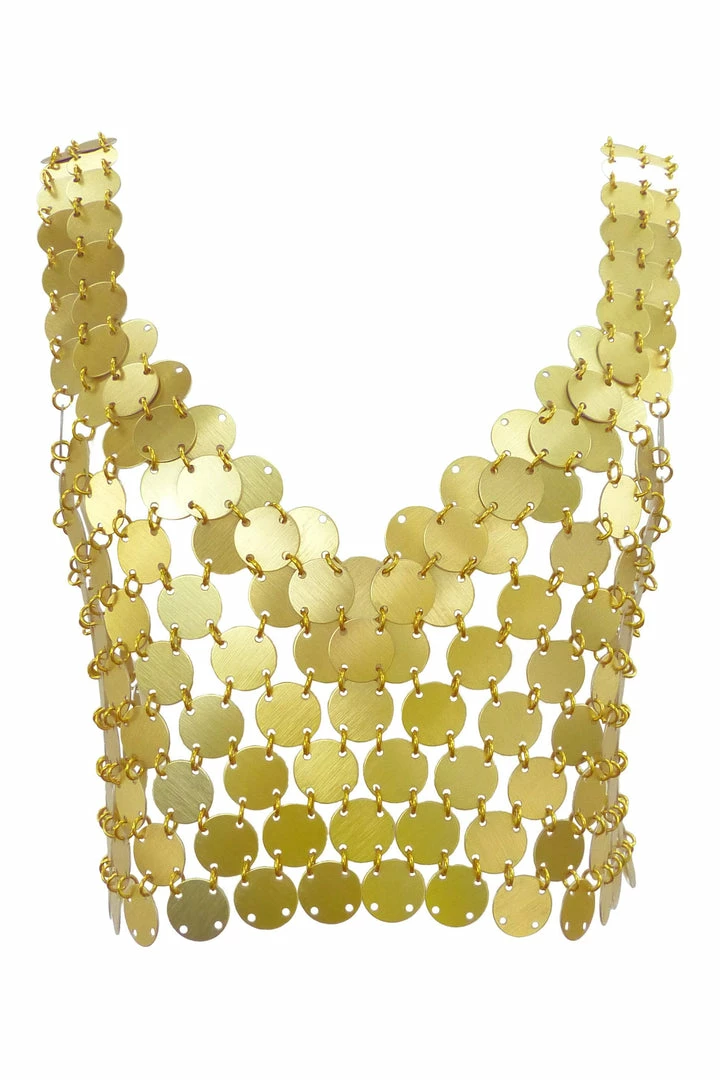 Deep v-neck metal top, handwoven from metal discs and rings in our Ibiza atelier.