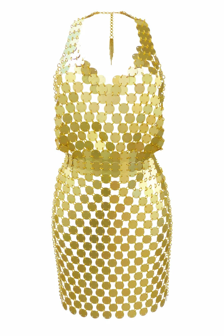 Show-stopping backless metal dress with adjustable straps, handwoven from metal discs and rings in our Ibiza atelier.