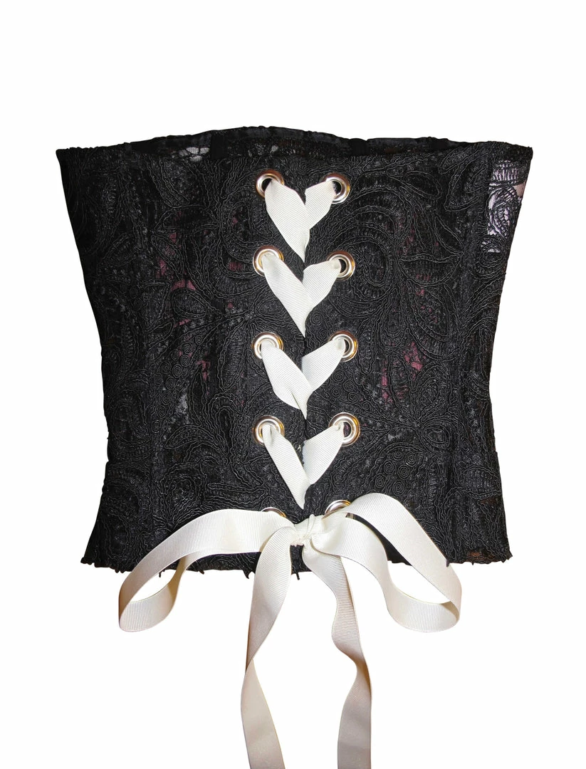Unlined. Fully boned for structure; stainless steel grommets at center back with a thick grosgrain ribbon.