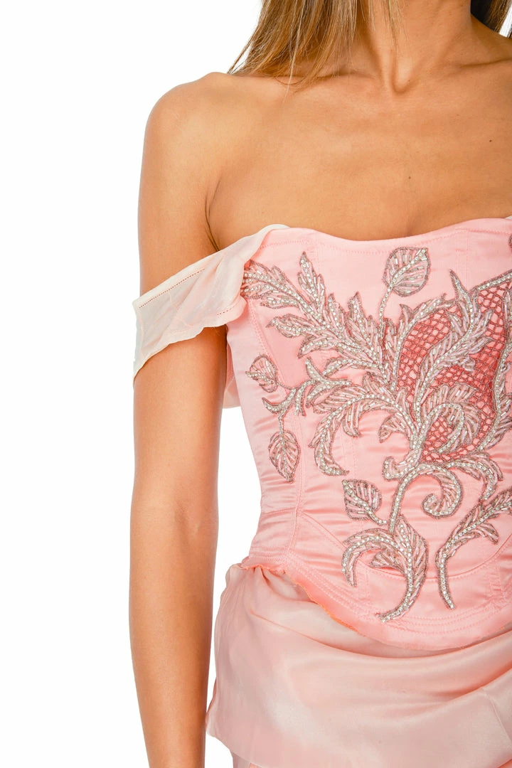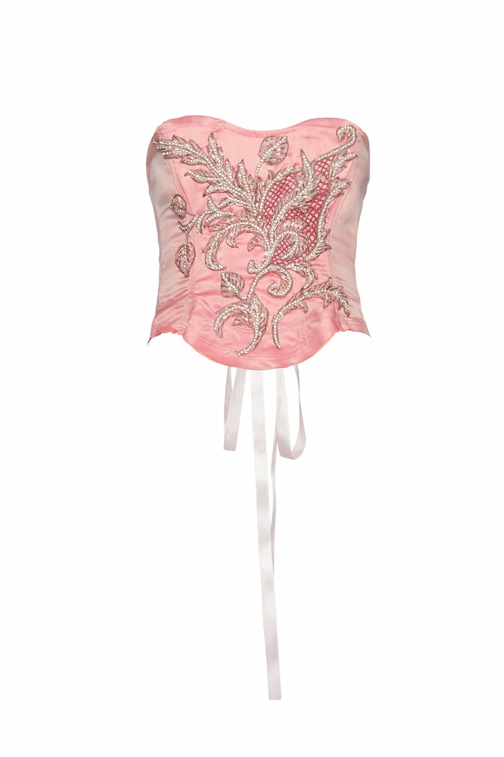Unlined. Fully boned for structure; stainless steel grommets at center back with a thick grosgrain ribbon.