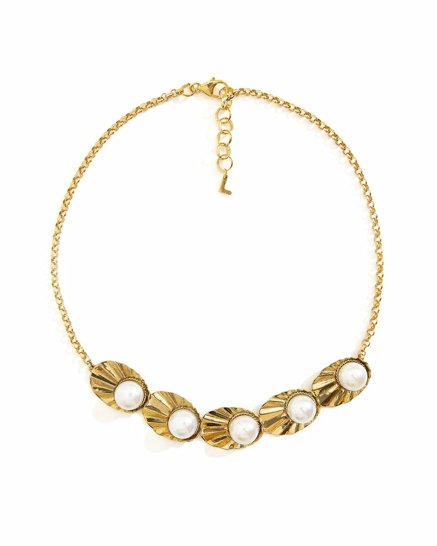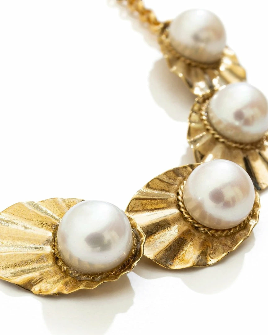 CONCH SHELL INSPIRED NECKLACE WITH NATURAL PEARLS IN ECO-SILVER AND 18 KT GOLD PLATED.