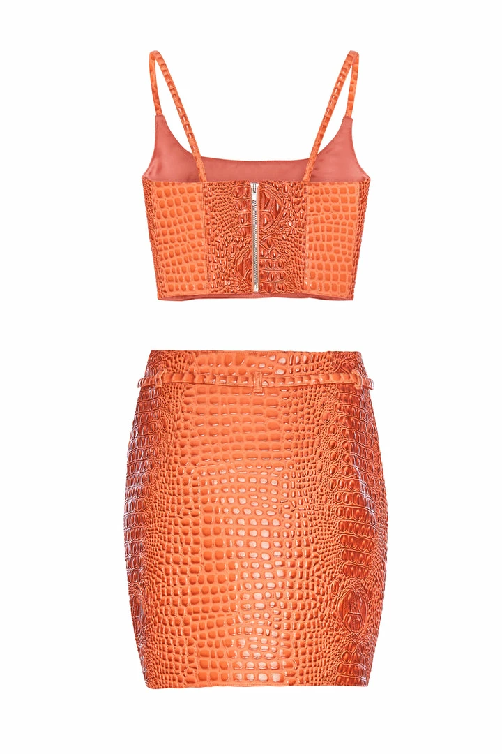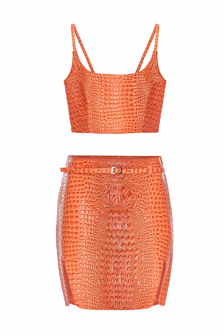 A faux crocodile crop skirt, lined in satin, featuring a center back zippered belt.